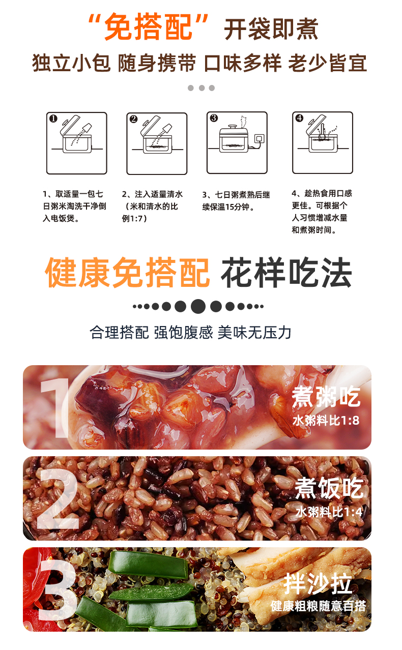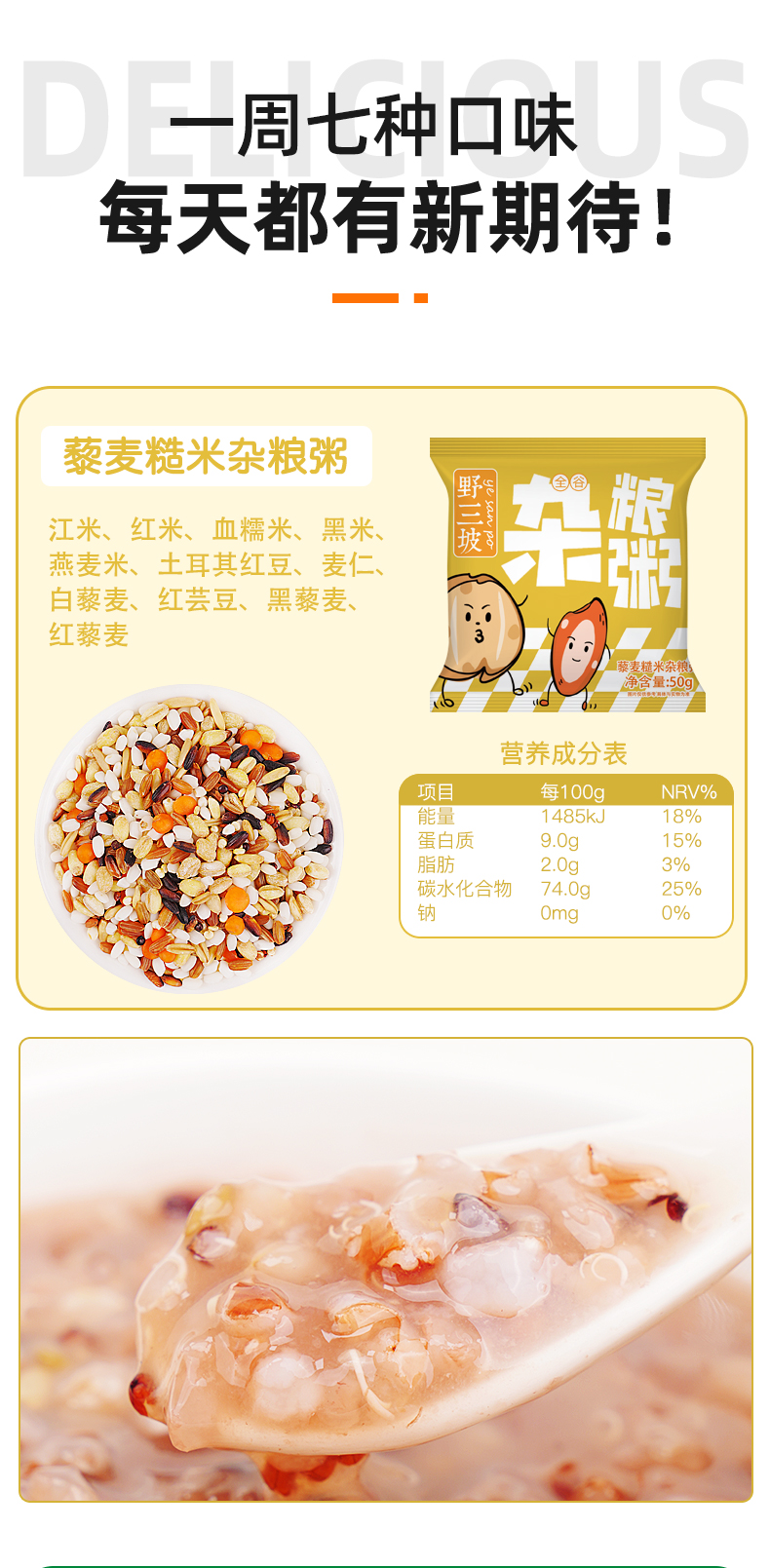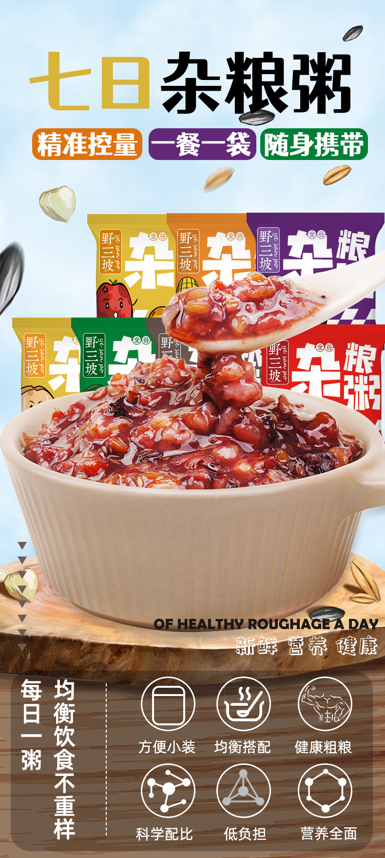 出单有投流(下图),这款杂粮粥真的很不错!口感很好,而且营养丰富。种小包装的杂粮粥,非常方便携带和储存。这款七日粥正好可以一周每天不重样