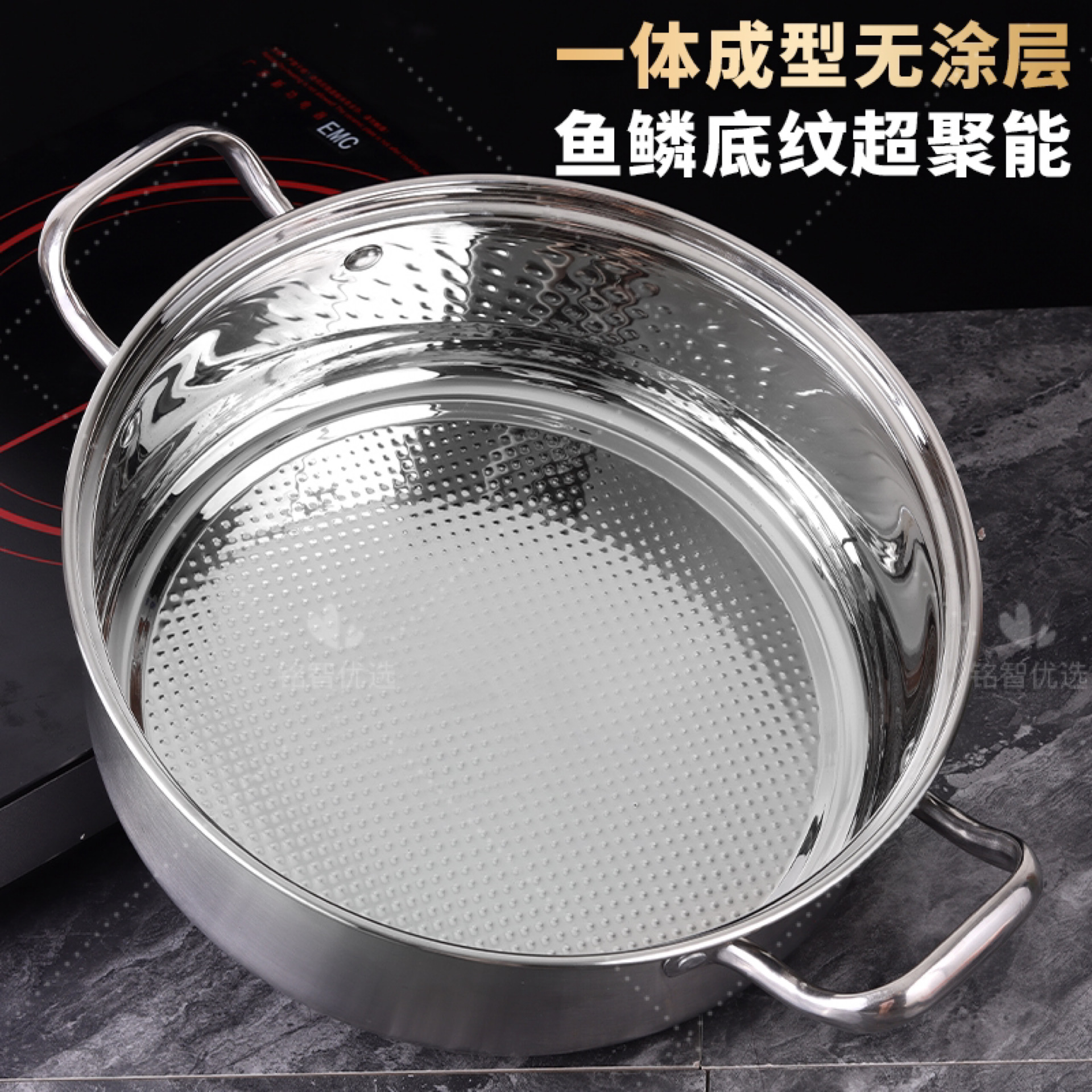 这款锅真的很棒!外观非常吸引人,而且无涂层设计让人放心。锅底看起来很特别,一体成型鱼鳞锤纹非常实用。