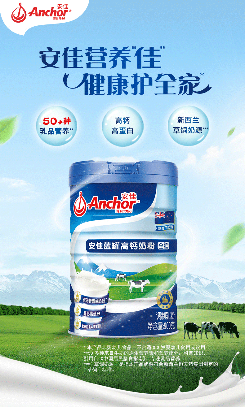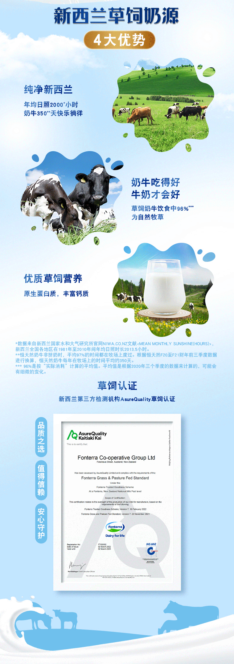 新西兰奶源。安佳百年来坚持天然原生态草饲放牧,南纬度40-50度,新西兰,黄金奶源带上的国家,纯净岛屿,远离工业污染。