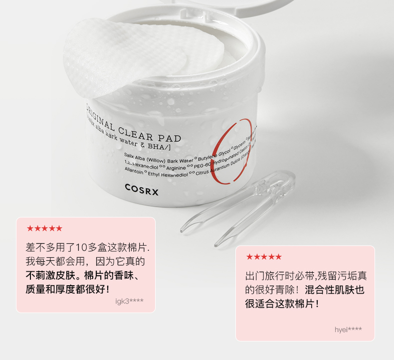 这款COSRX水杨酸棉片真的很好用!我脸上的痘痘和闭口明显减少了,而且皮肤也变得更加光滑了。价格也很合理,非常推荐!