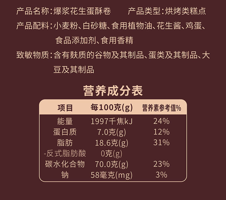 内容:这次购买的夹心爆浆花生蛋酥卷真是太让人惊喜了!首先,价格方面,9.9元就能到手两盒,每盒105g,性价比超高,完全满足了我这个零食控的需求。