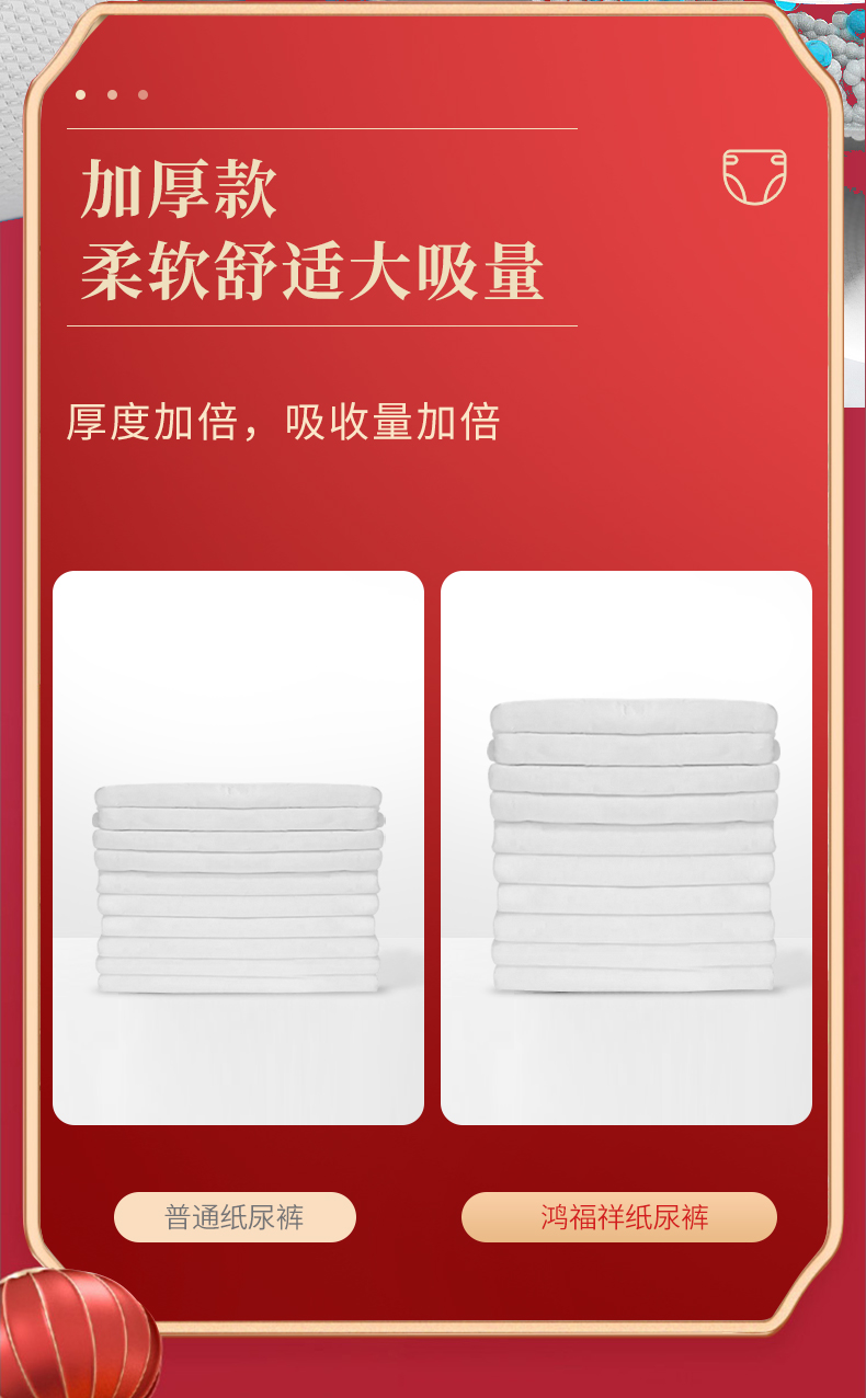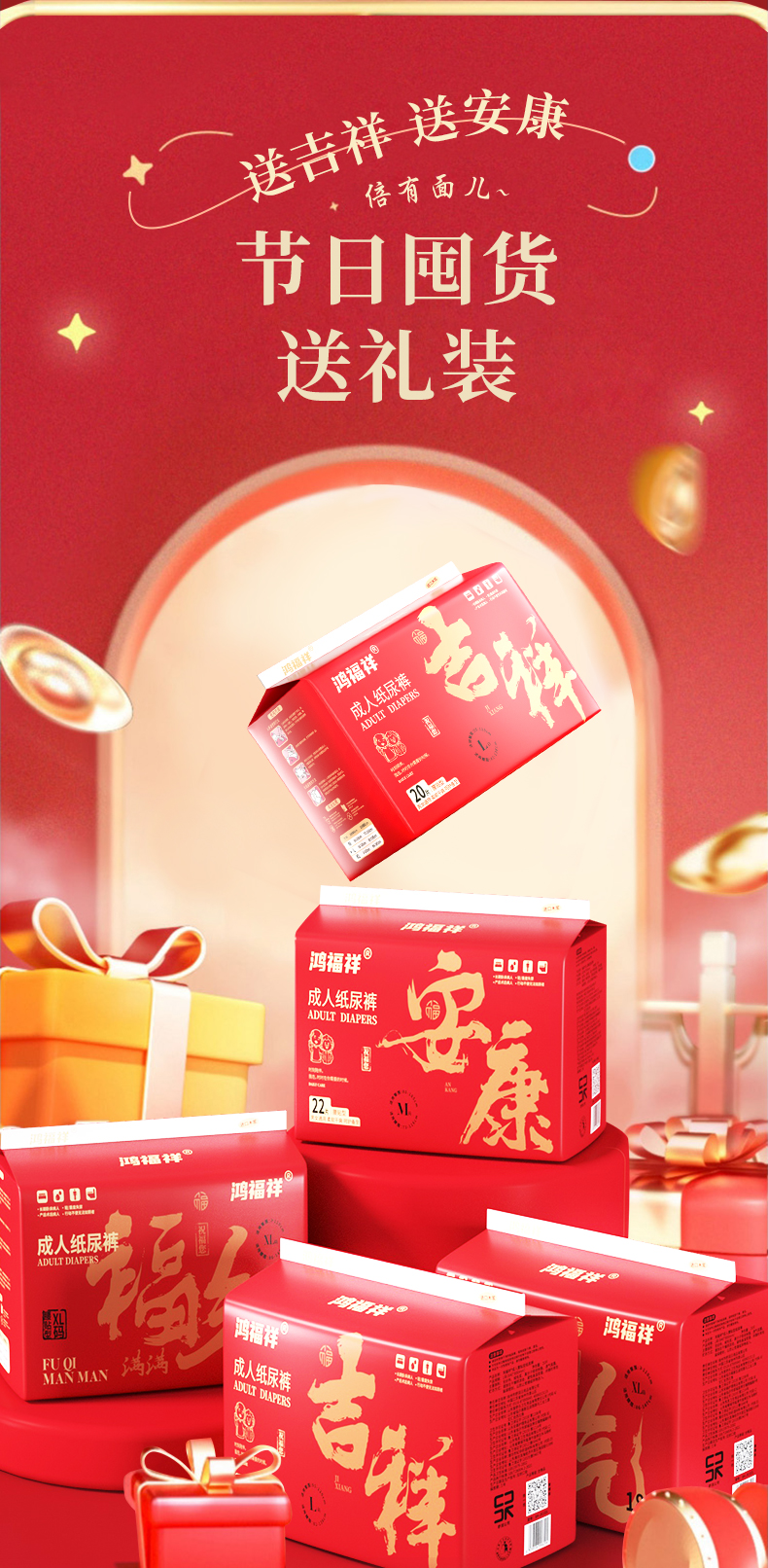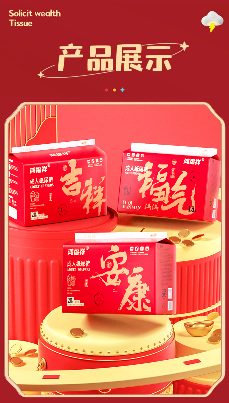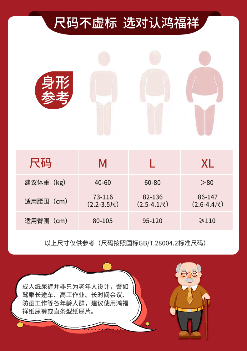 该商品是一款适合老年人的纸尿裤,适合需要长时间使用纸尿裤的人群。商品规格为吉祥福气·贺年的M码,适合体型中等或偏瘦的老年人使用。该商品价格实惠,为36.99元,且商品附加价值高,采用鸿福祥品牌,具有高端、优质的特点