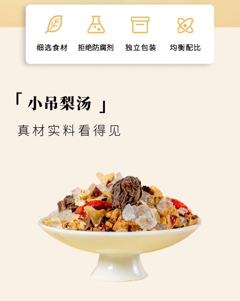 1. 很喜欢这款小吊梨汤,口感很好,很适合秋冬季节喝,价格也很实惠。