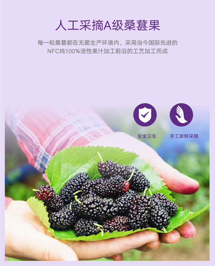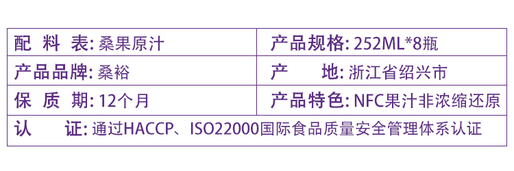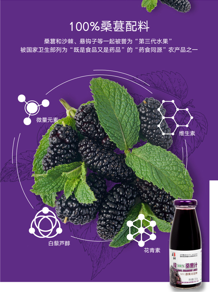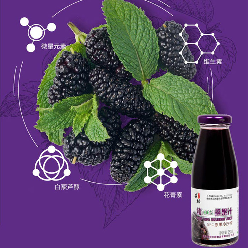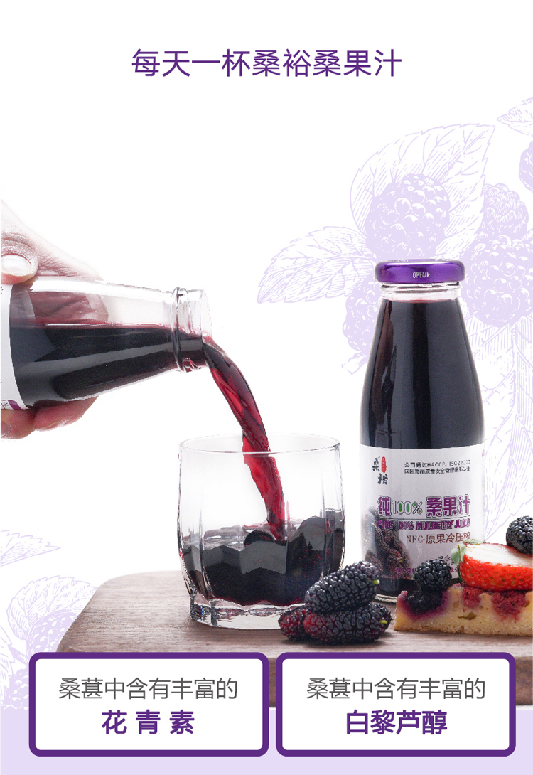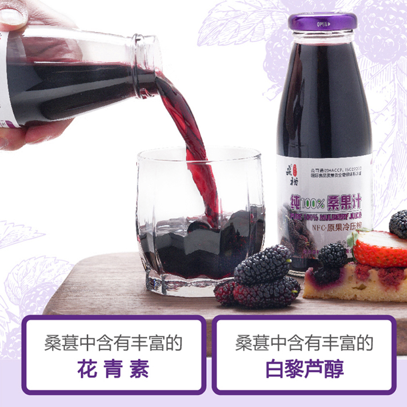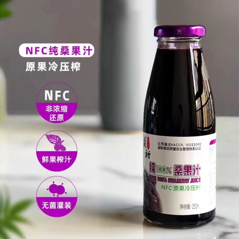 桑裕NFC桑果汁100%桑椹原汁纯鲜果冷压榨果蔬汁玻璃瓶装252ml*8瓶