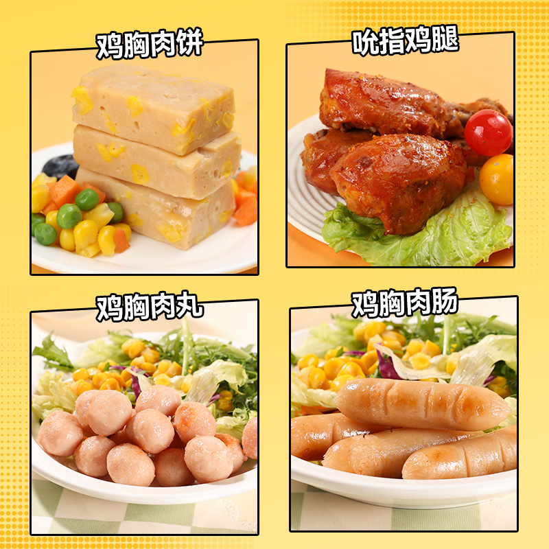 【到手45件】鸡胸肉饼60g*15袋+鸡肉肠25g*12根+鸡肉丸25g*12条+鸡腿75g*2袋+小鸡腿25g*4袋,1750g*1箱