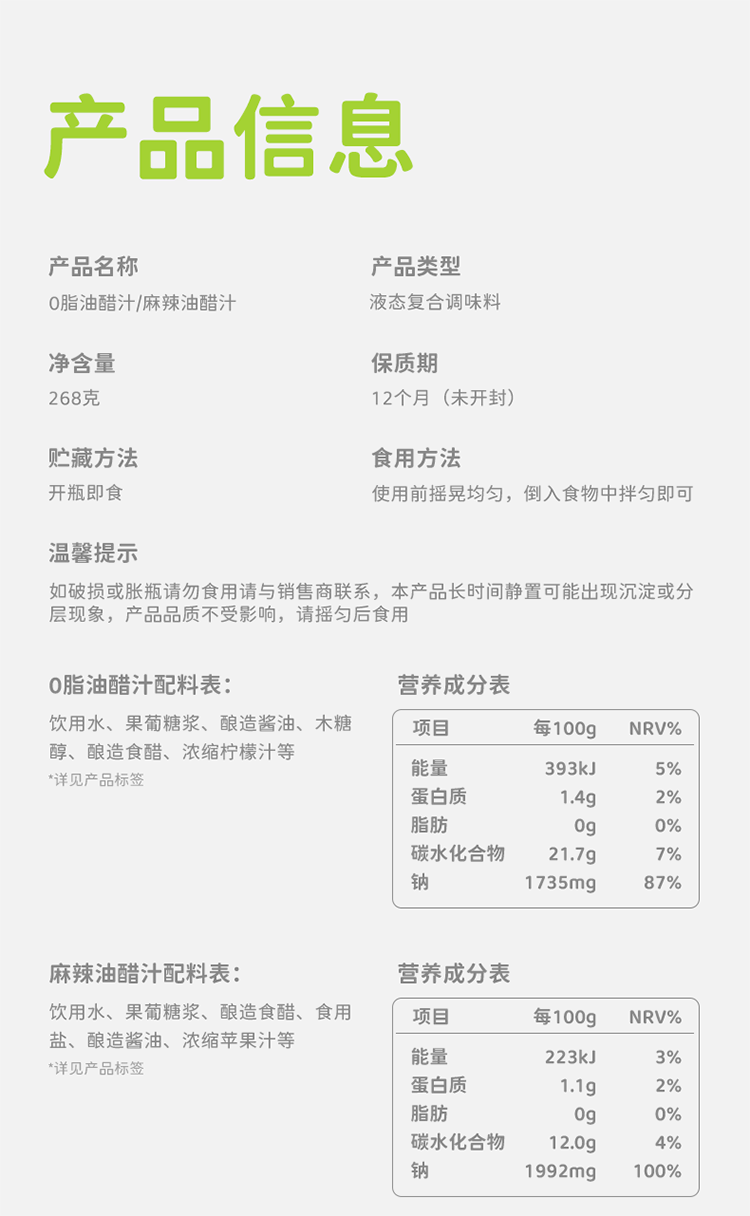- ¥17.90【混搭两瓶】0脂油醋汁*1+麻辣油醋汁*1瓶
