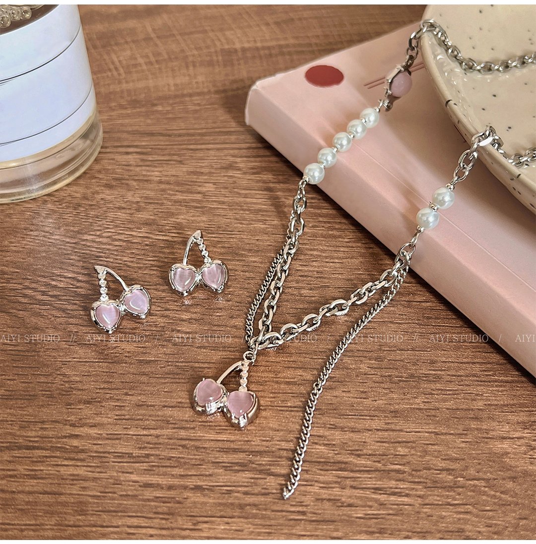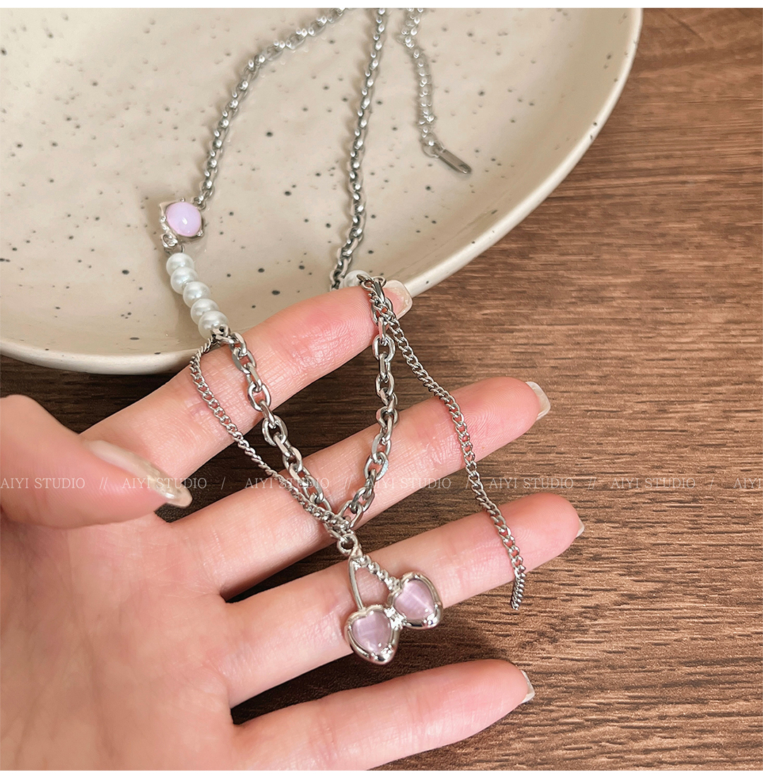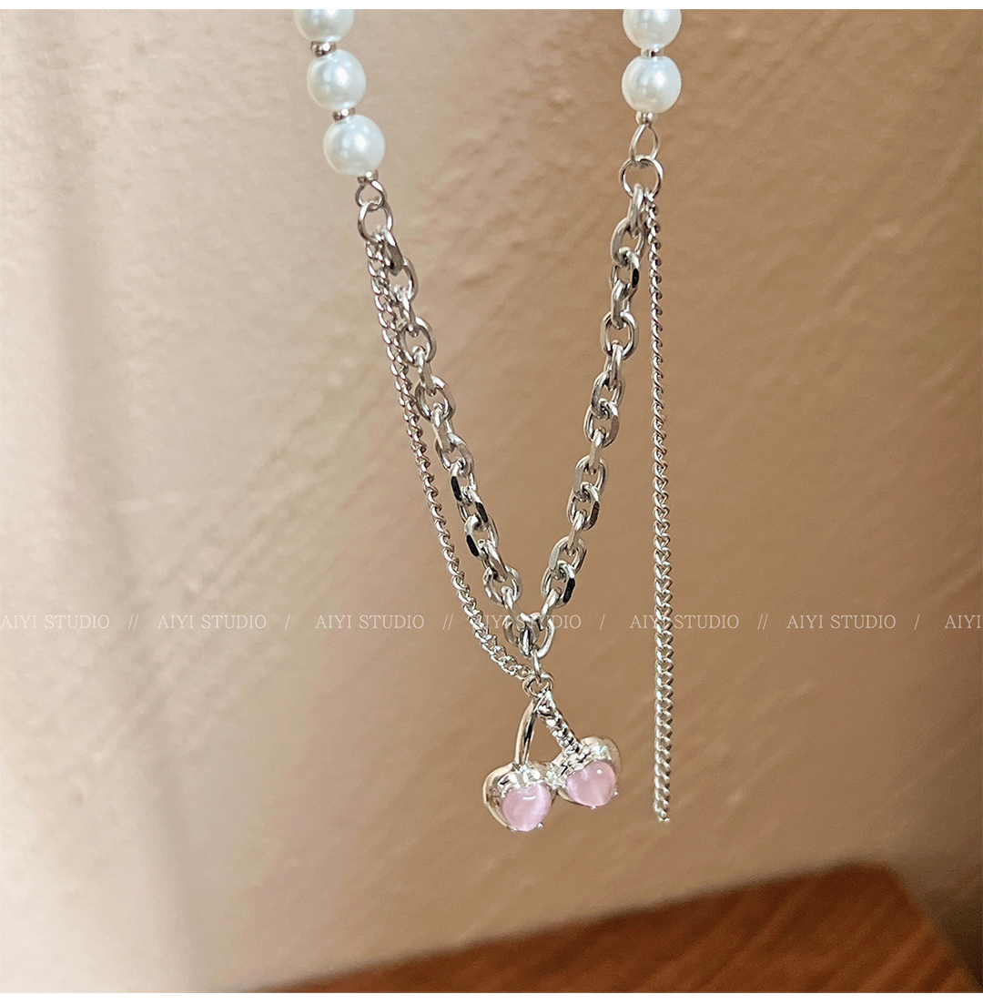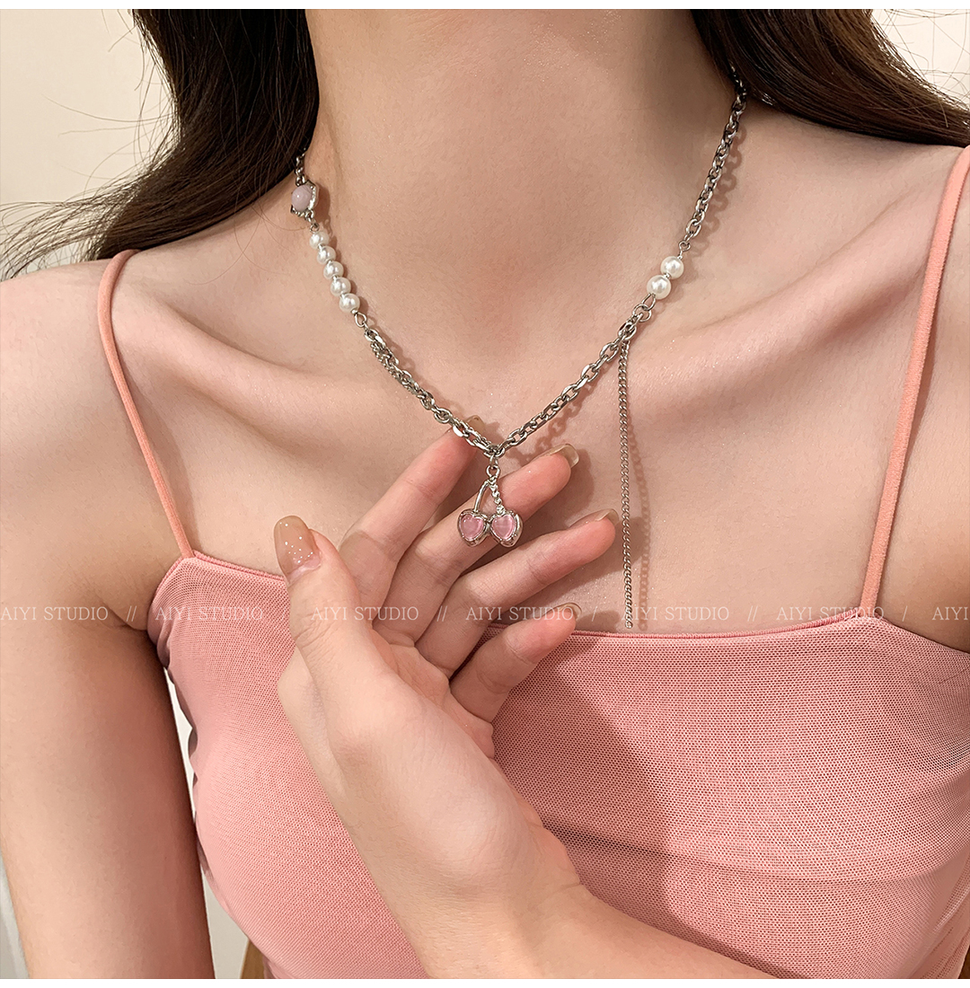 合金项链 粉色樱桃珠珠拼接颈链女春夏流苏小众高级感锁骨链配饰~