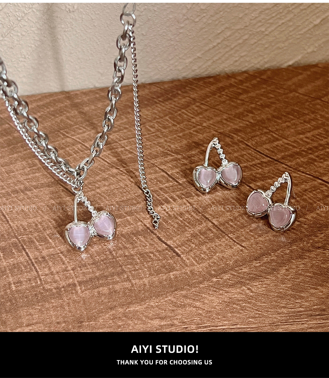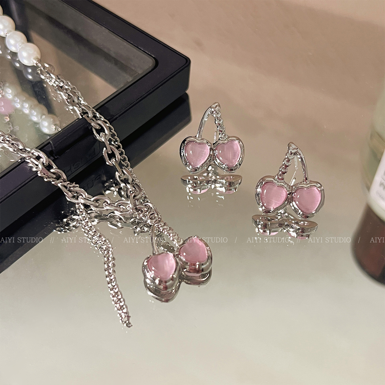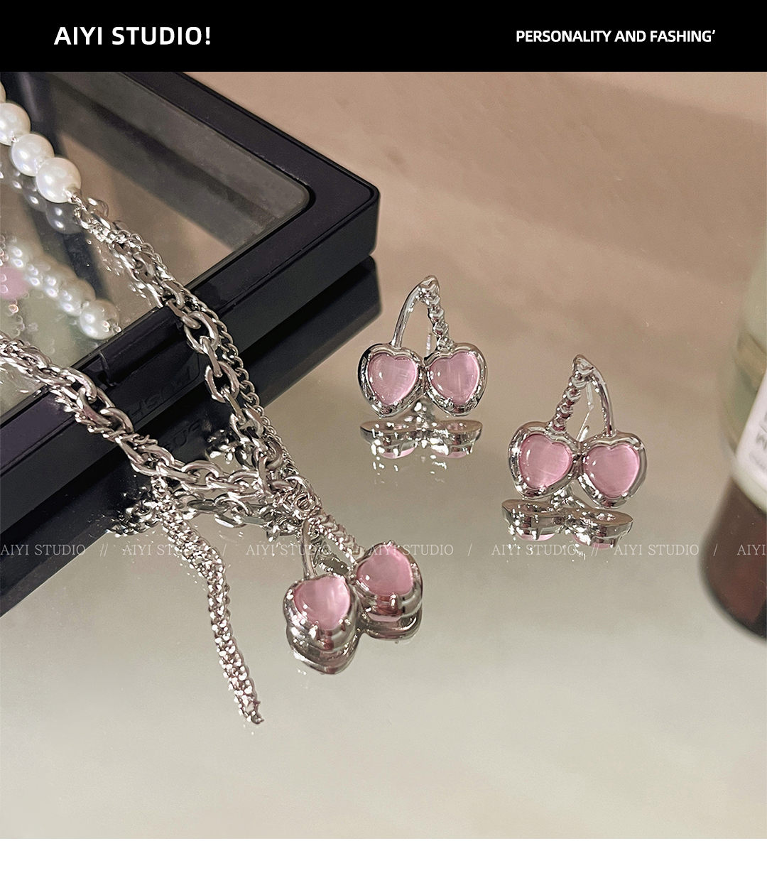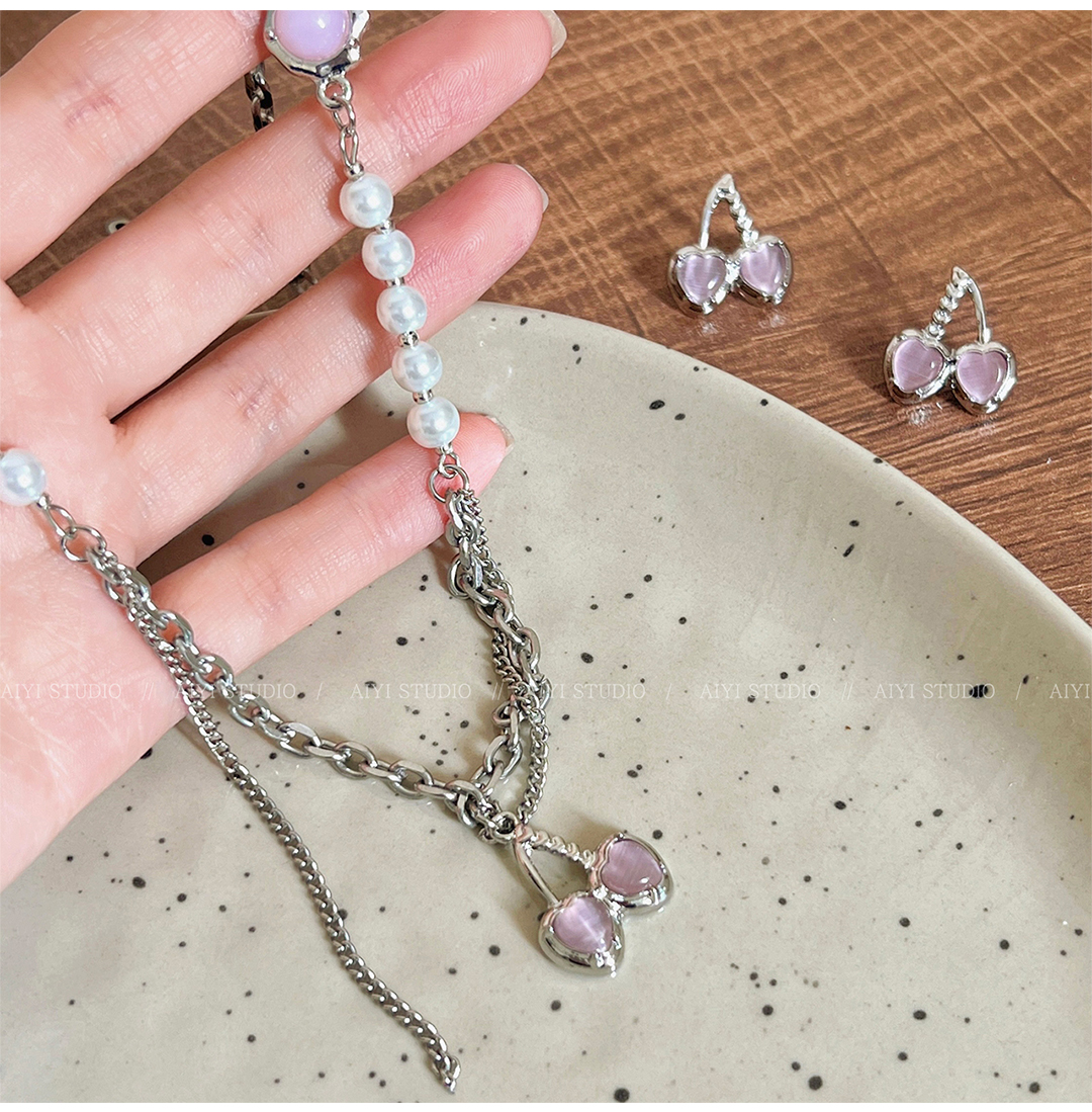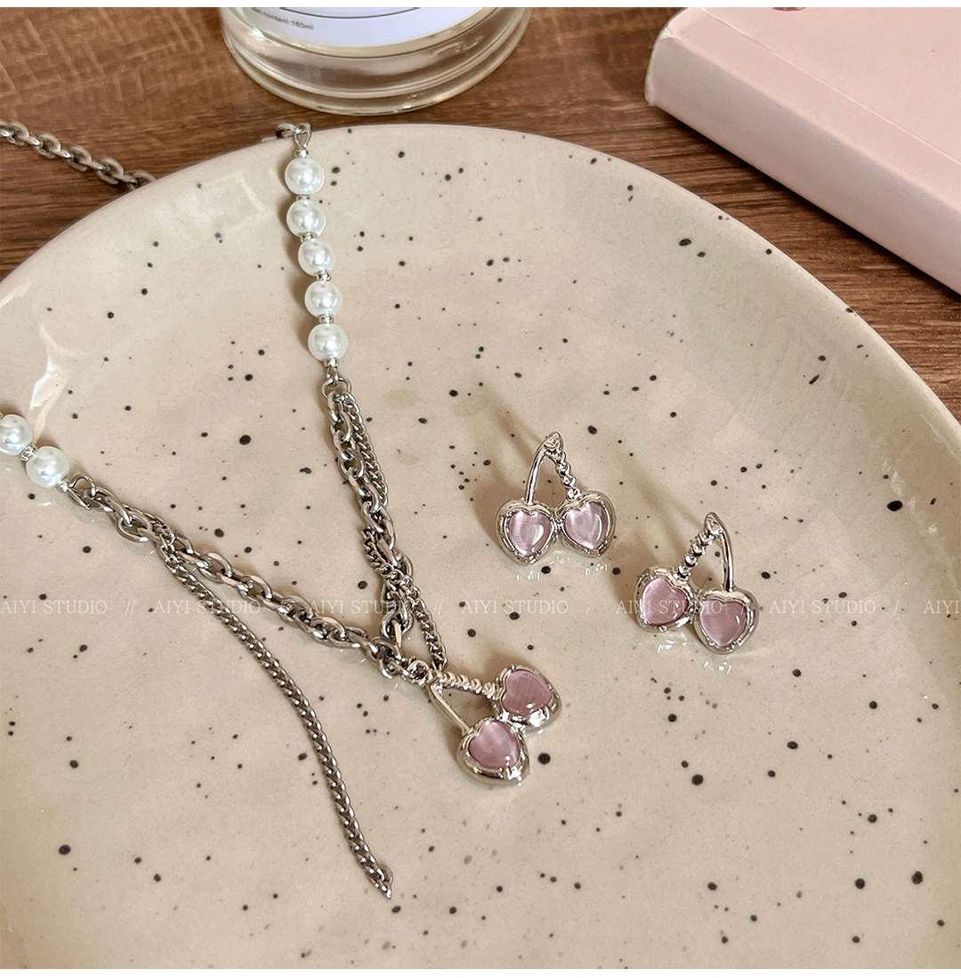 合金项链 粉色樱桃珠珠拼接颈链女春夏流苏小众高级感锁骨链配饰~