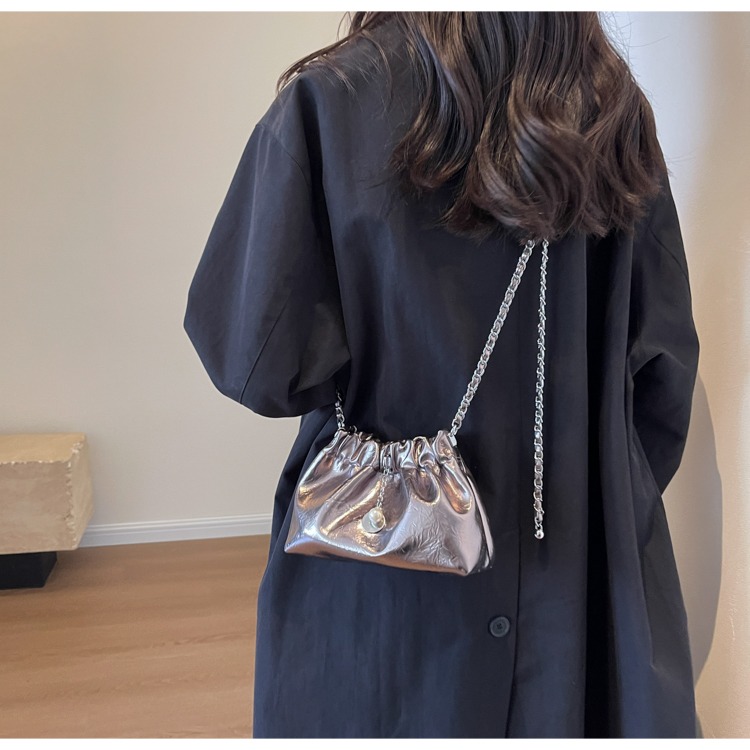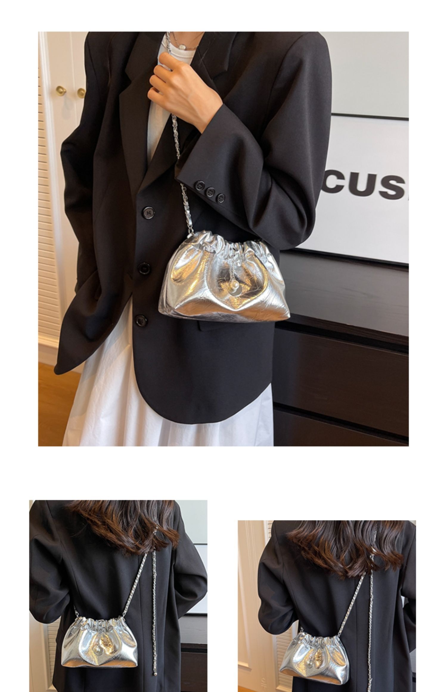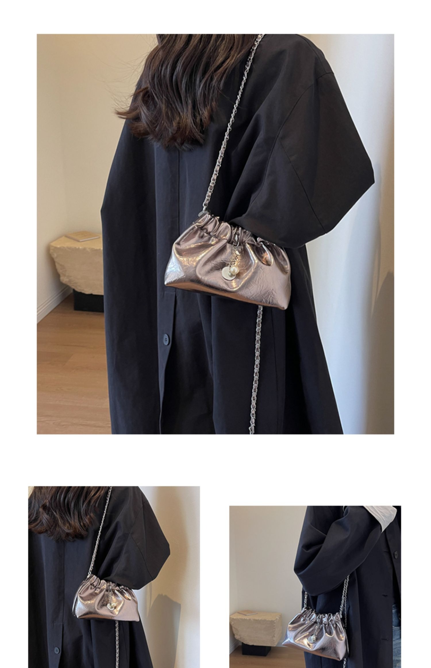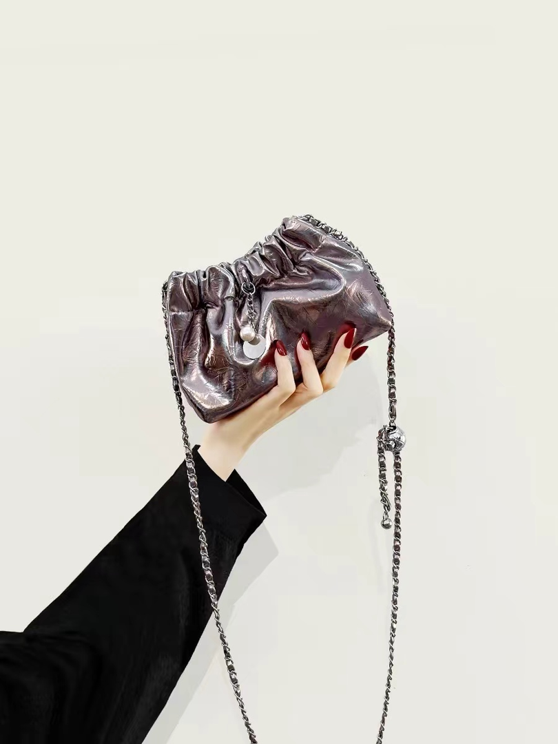 单肩高级感小众百搭斜跨链条包包女2025新款银色抽绳水桶包云朵包