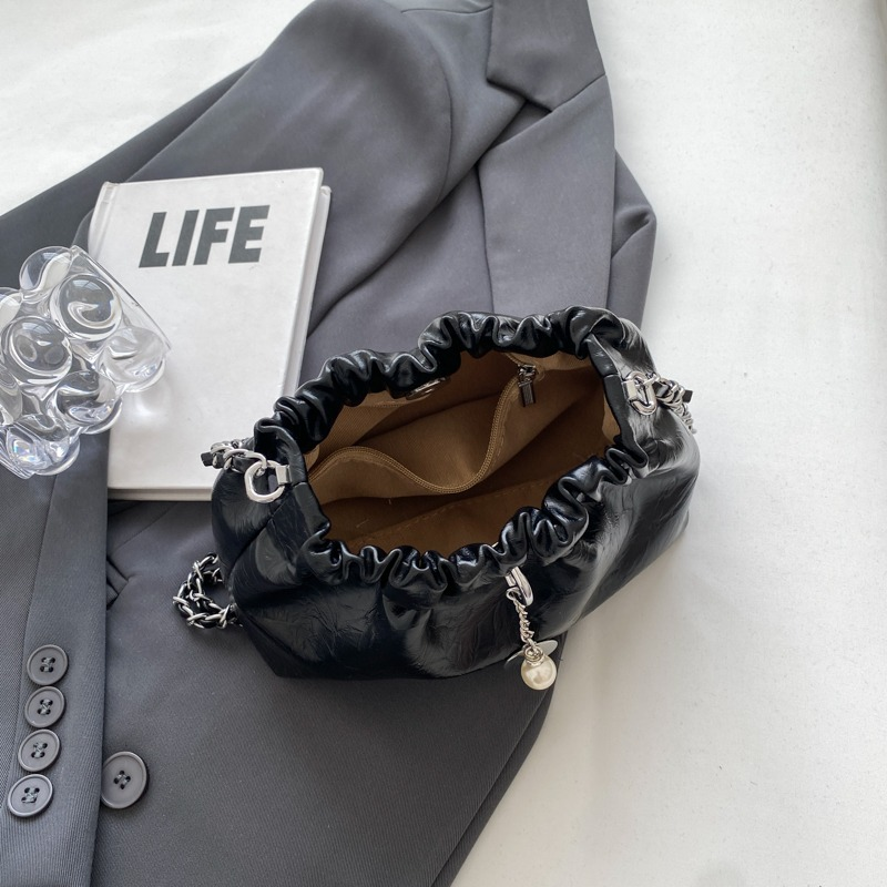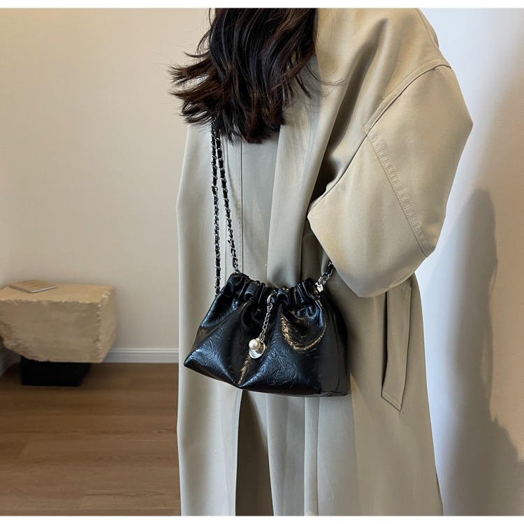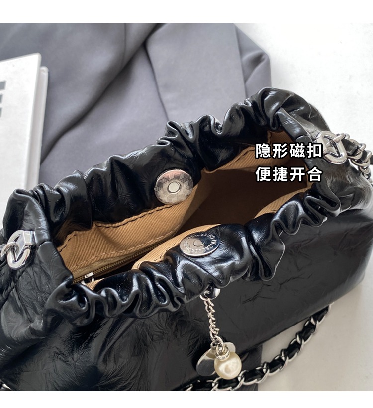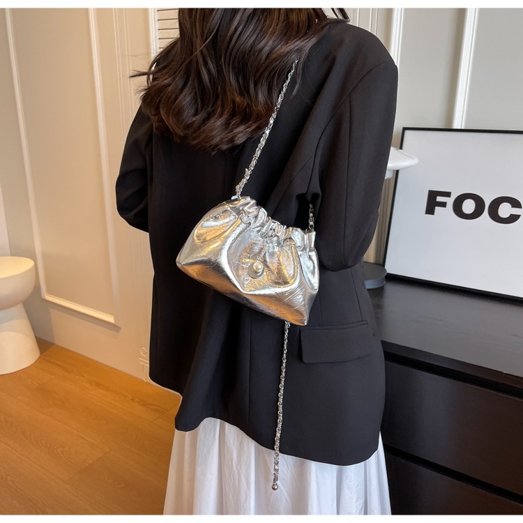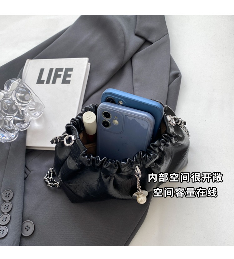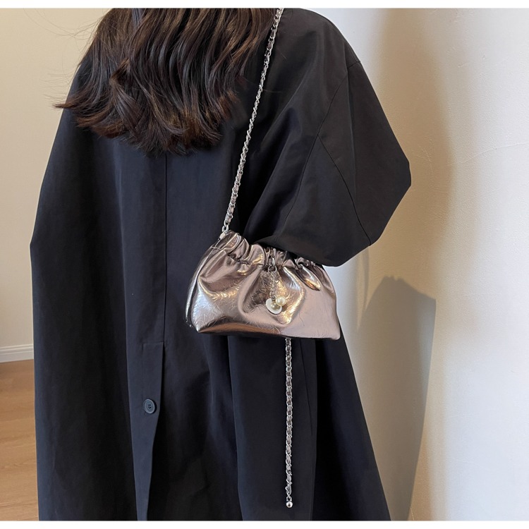 单肩高级感小众百搭斜跨链条包包女2025新款银色抽绳水桶包云朵包
