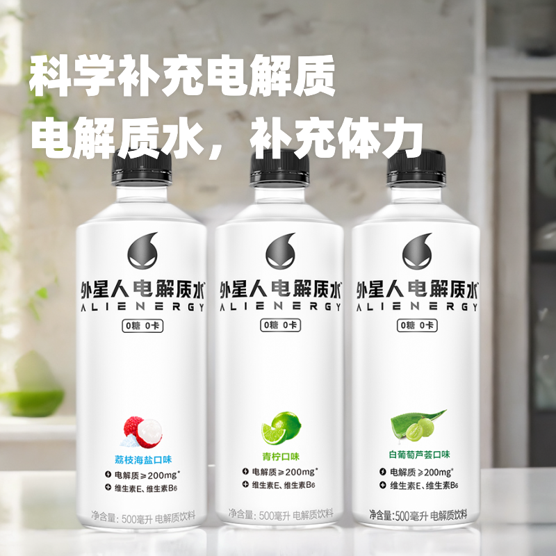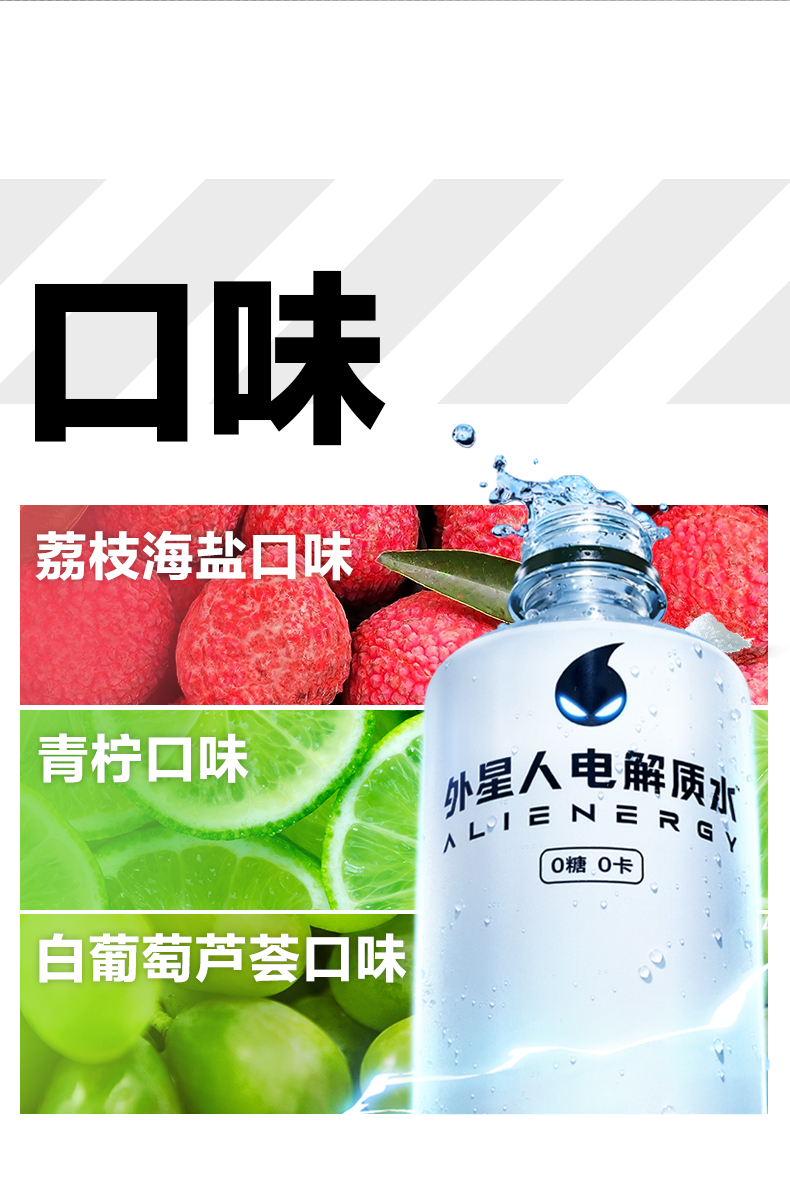 外星人电解质水的口味选择非常丰富,荔枝海盐、青柠和白葡萄芦荟都有,