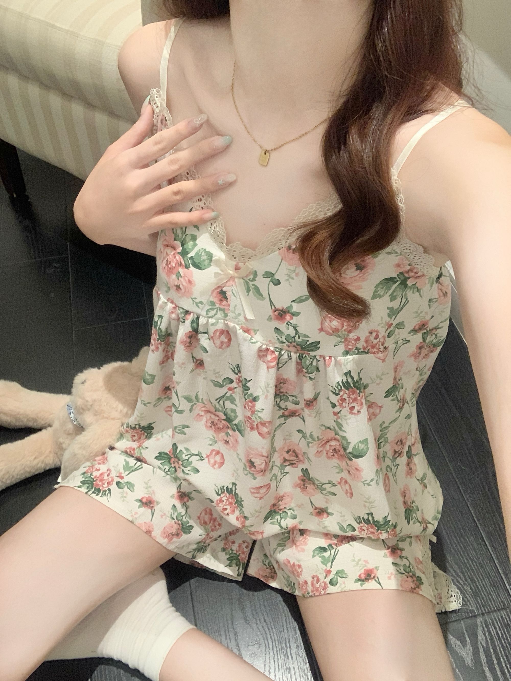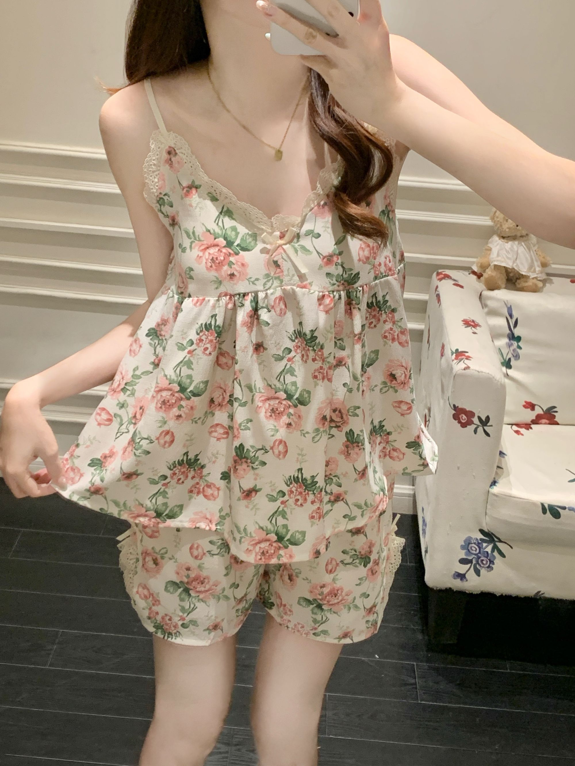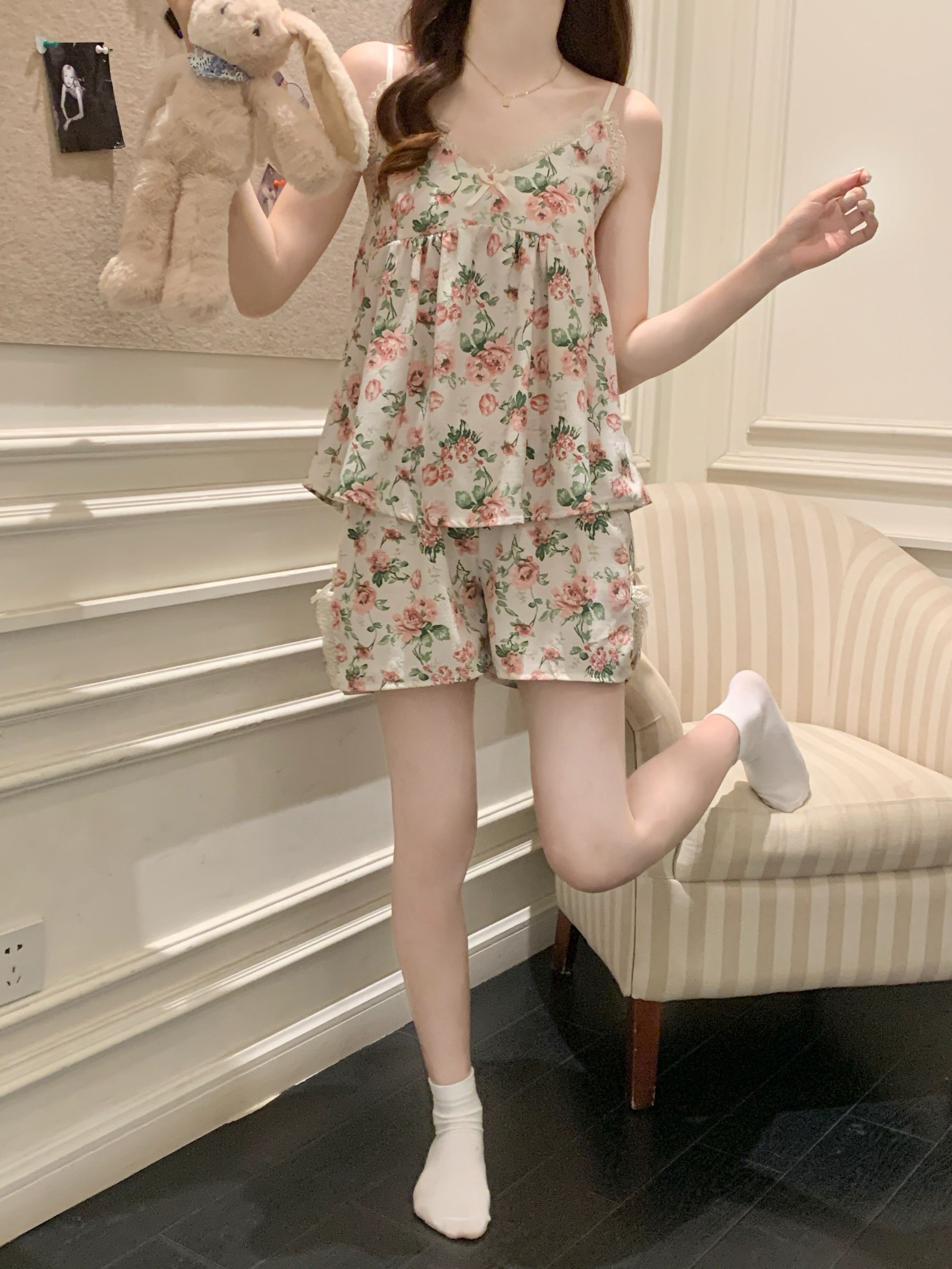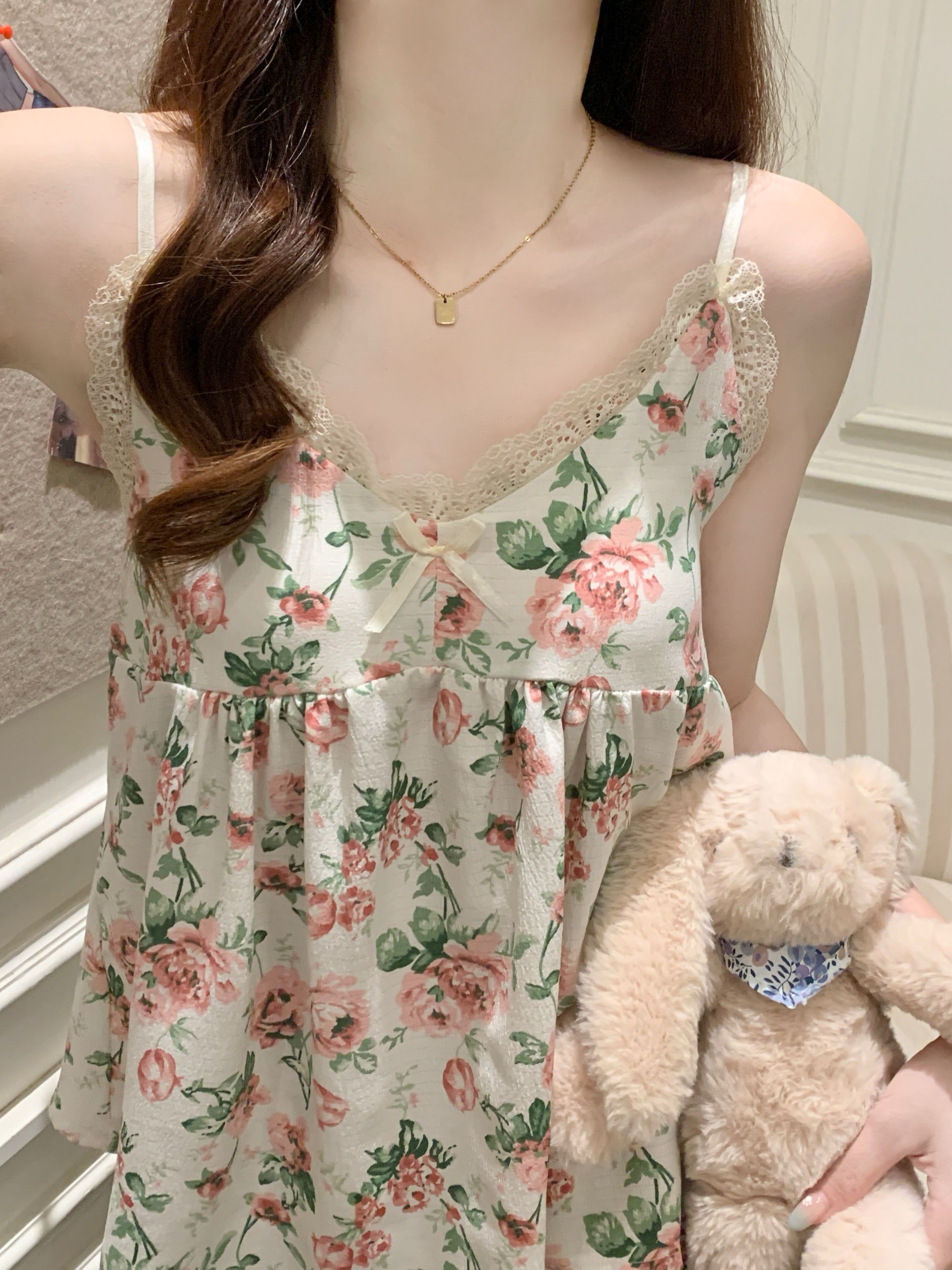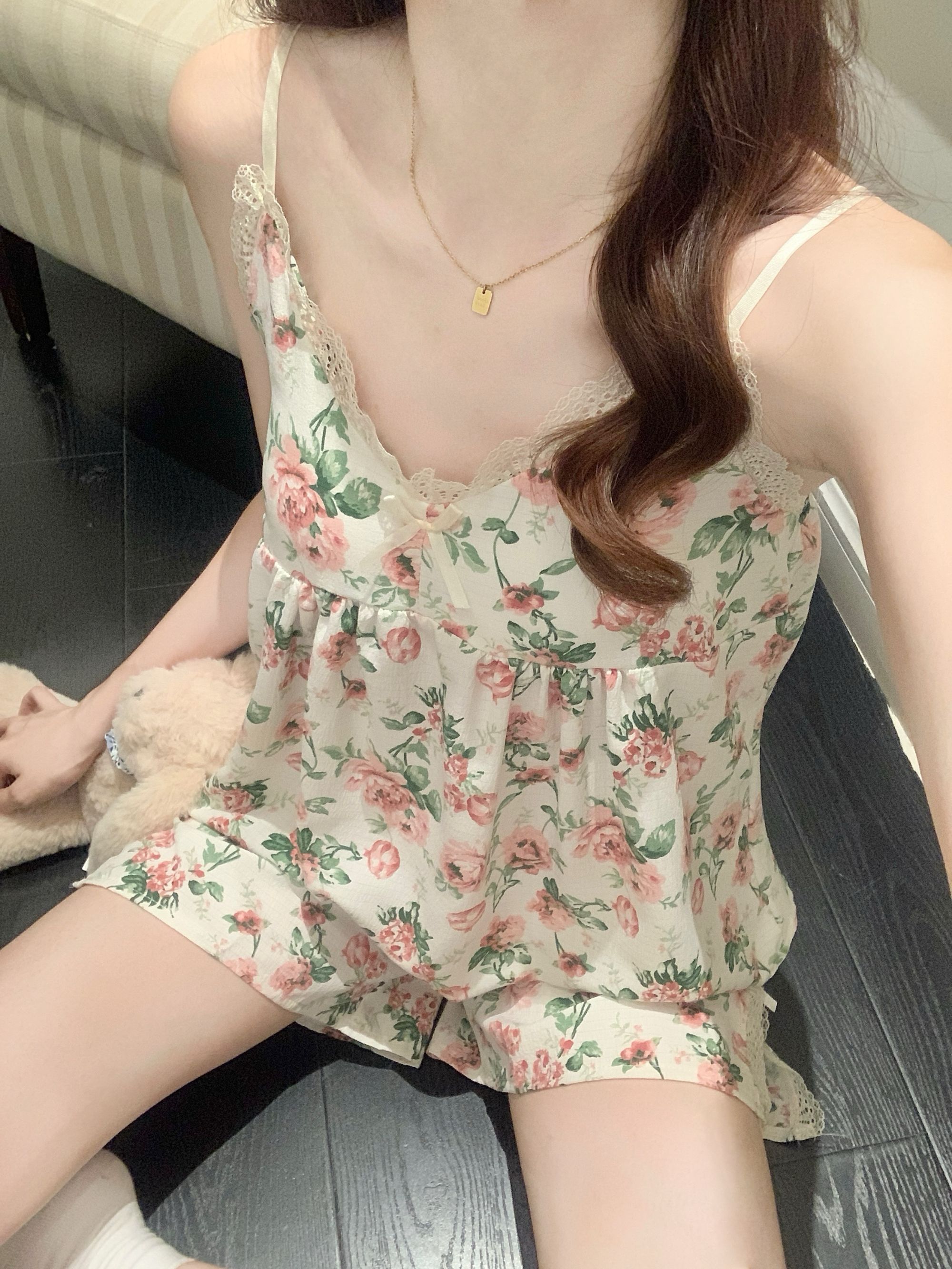 【小熊原创】2024年爆款法式花园玫瑰夏季泡泡皱布睡衣女可拆卸胸垫