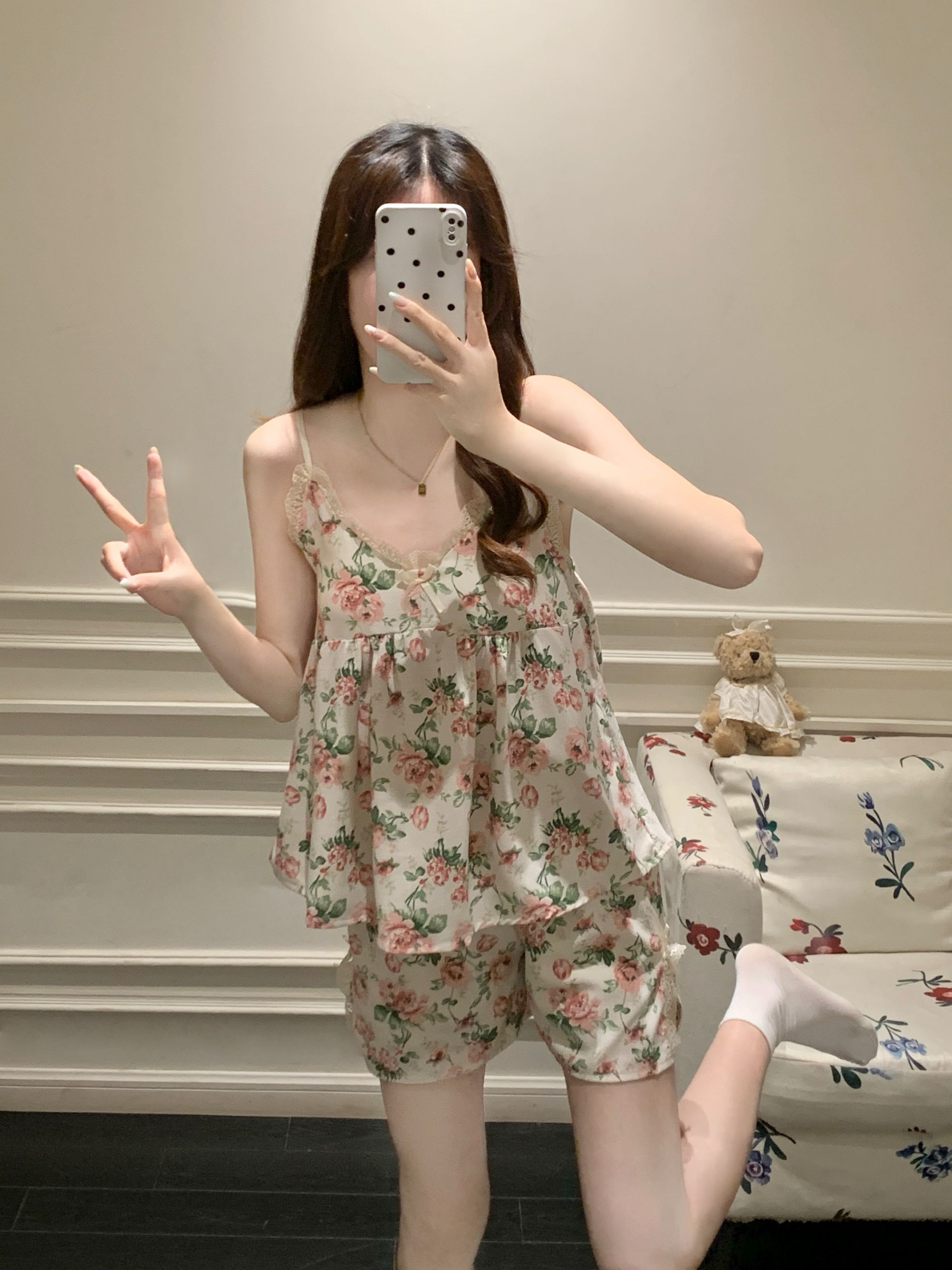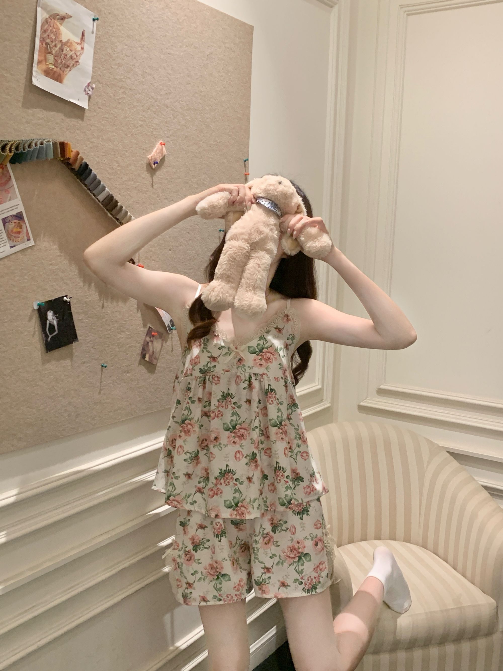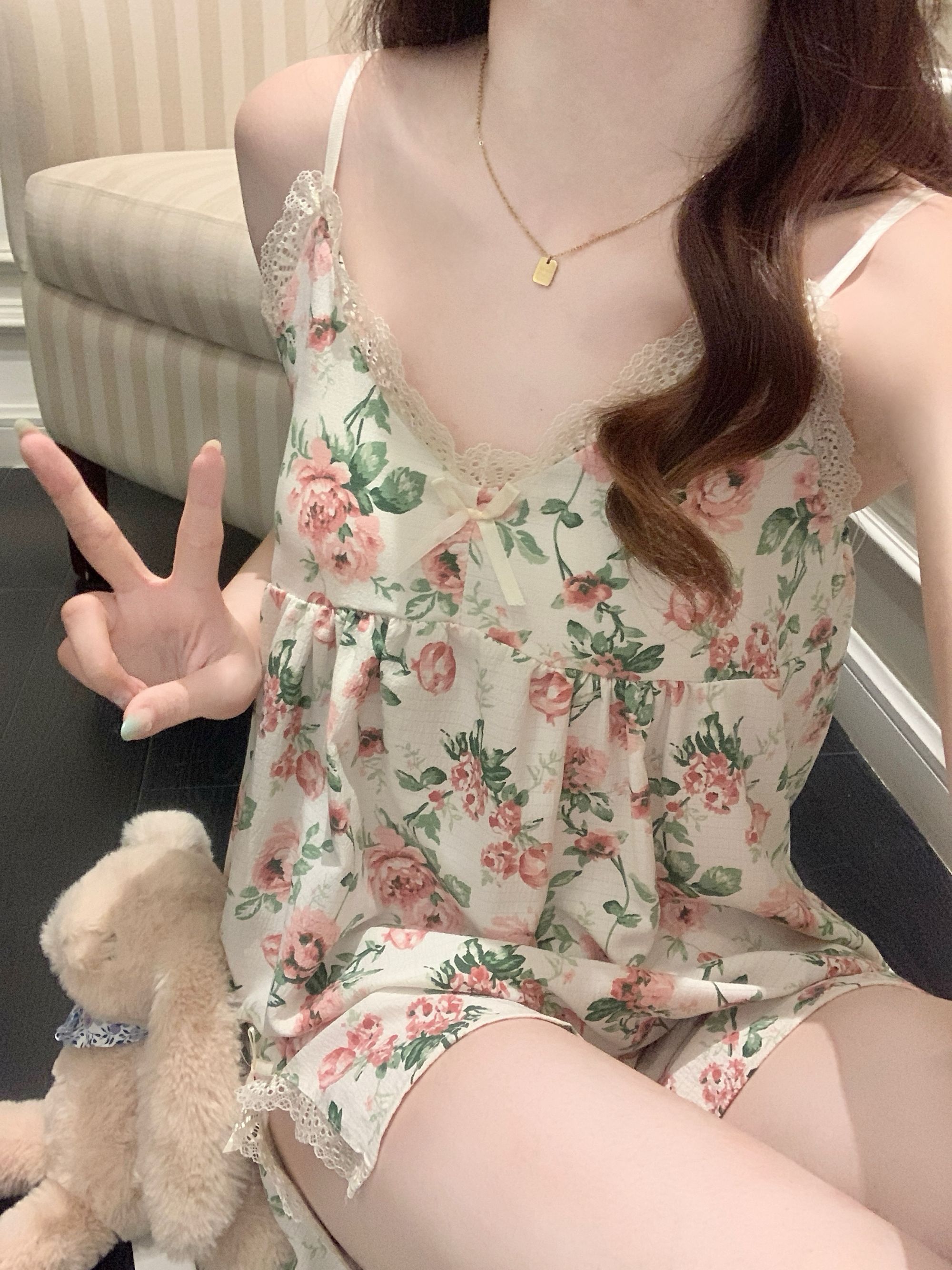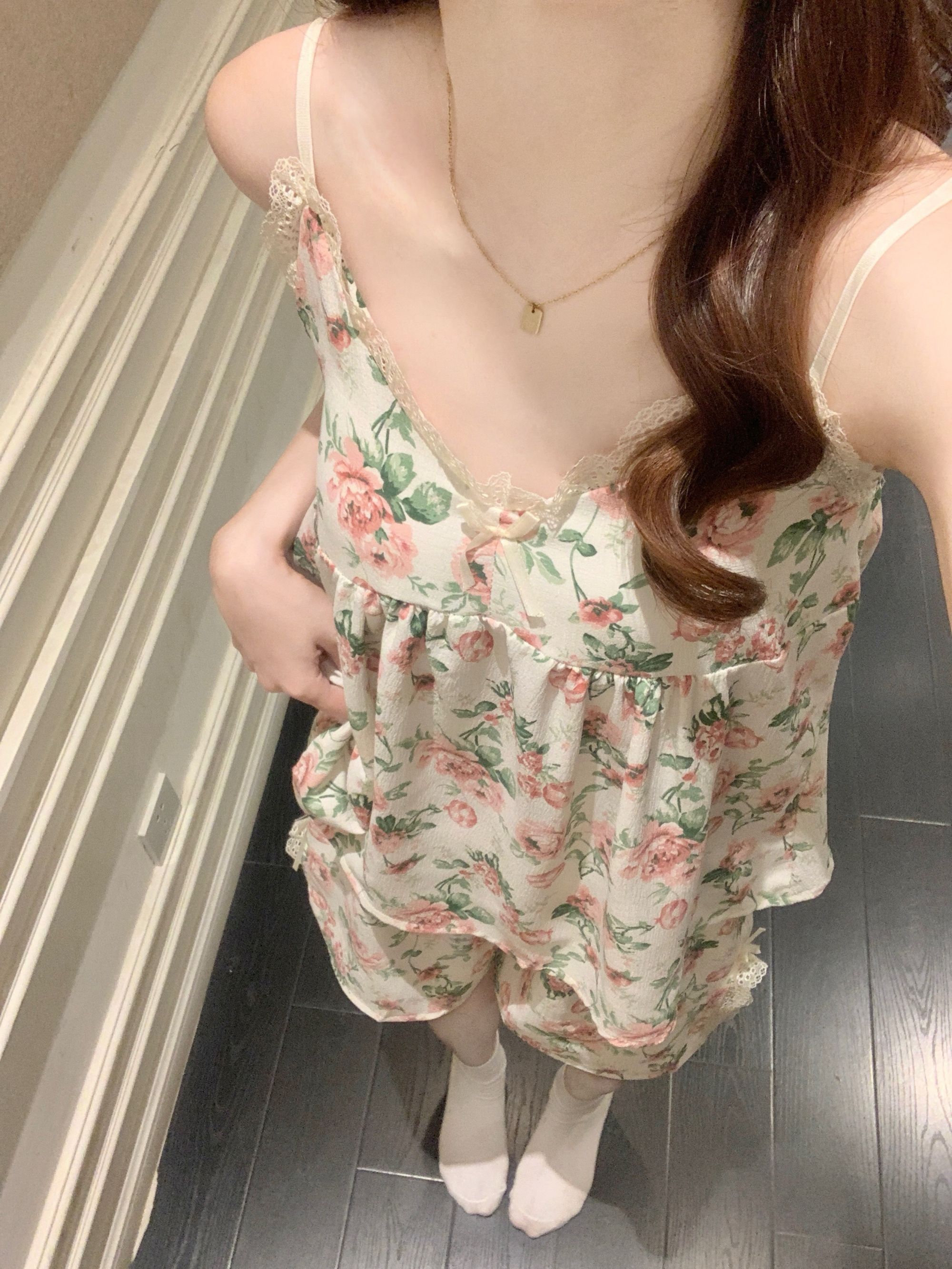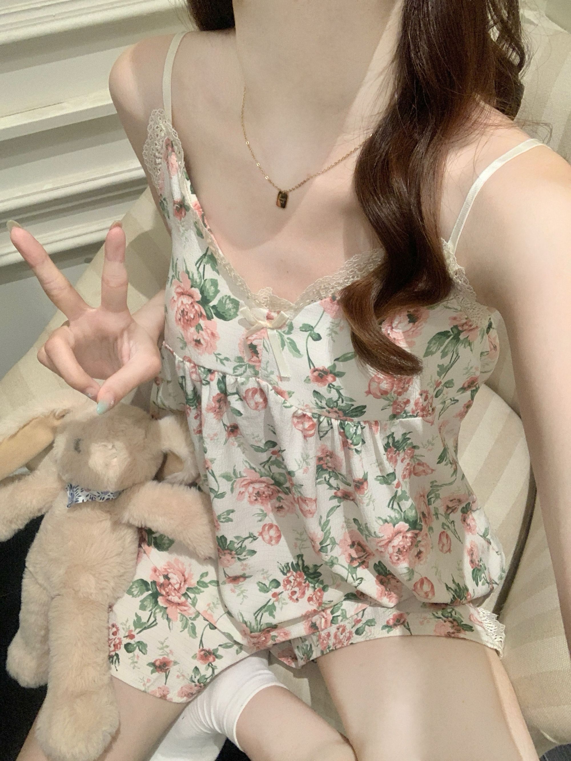 【小熊原创】2024年爆款法式花园玫瑰夏季泡泡皱布睡衣女可拆卸胸垫