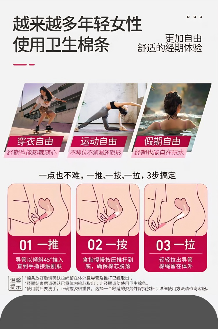 1. 这款卫生棉条真的很好用!包装很精美,一看就是质量有保障的产品。使用起来也很方便,无感隐形,真的就像没有带一样。