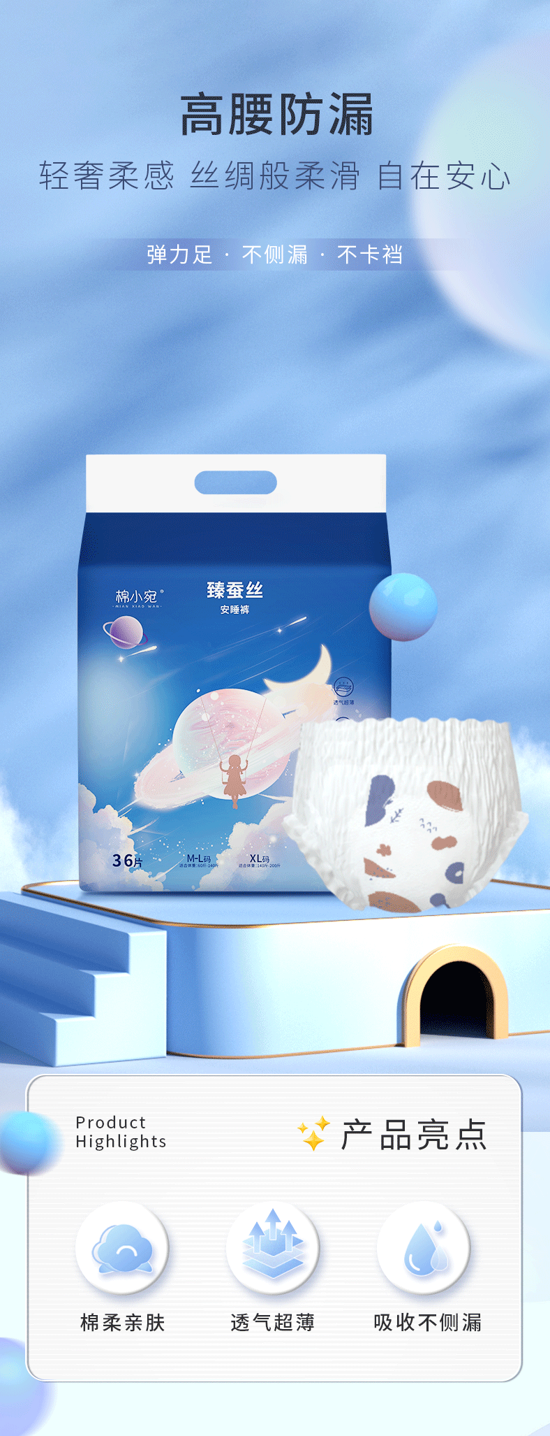 棉小宛【19.9元36条】安心裤裤型卫生巾防漏安睡裤透气日夜用姨妈巾