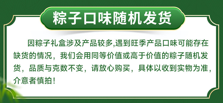 6. 总体来说还不错,但是口味和之前买的有点不一样,不知道是不是不同批次的粽子。 总的来说,该商品得到了大部分买家的好评,主要是因为口味丰富、价格实惠、包装精美等优点。但也有些买家提出了包装不够精致、口味单一或价格偏高的问题。因此,卖家可以根据这些反馈来改进商品,例如增加更多口味的粽子礼盒、改进包装等,以满足更多买家的需求。