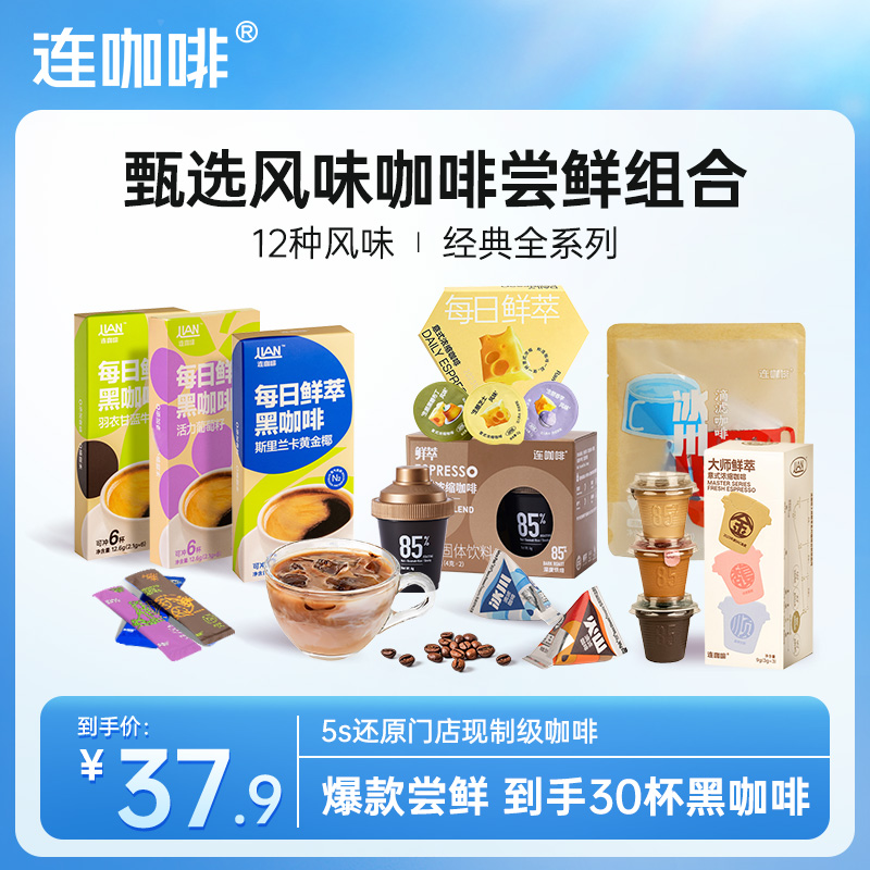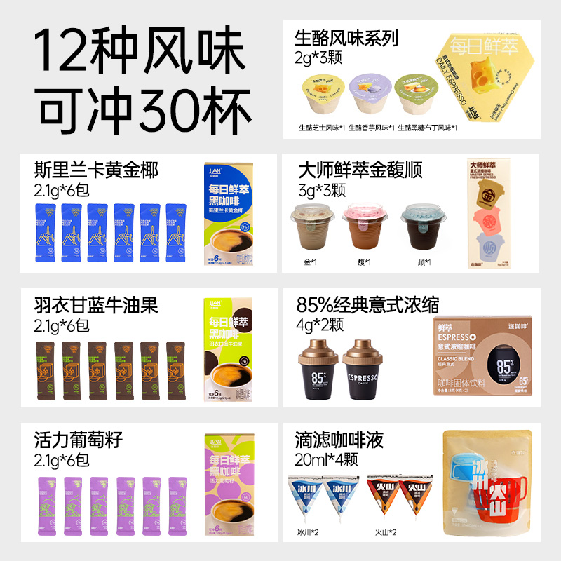 【超值30杯】连咖啡鲜萃意式浓缩多风味全家桶速溶黑咖啡冰美式
