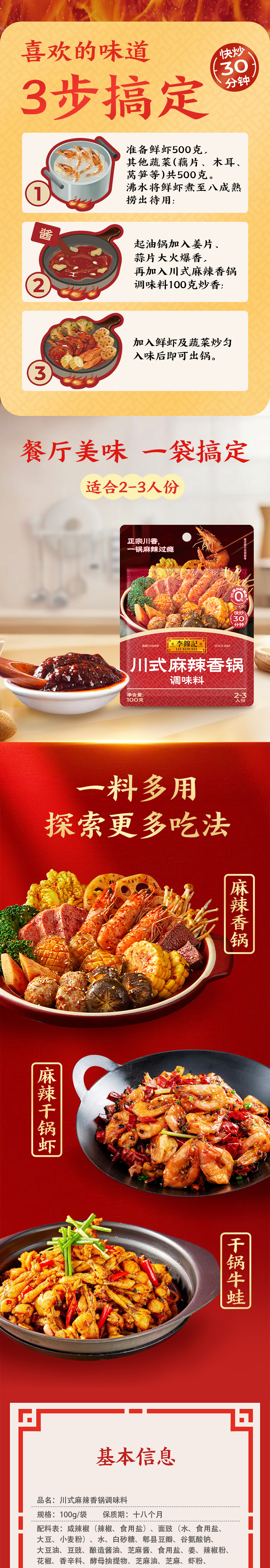- ¥19.90 【吃辣爱好者,总有一款适合你】川式麻辣香锅100g*1袋+麻辣小龙虾100g*1袋+酸辣金汤酱100g*1袋