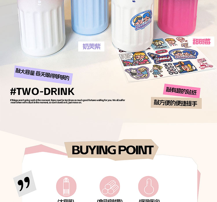 买家四:这款保温杯的设计很人性化,特别是便携和高颜值的特点,颜色很漂亮,适合送给朋友或自己使用。冰透白的颜色特别适合夏天,保温效果也很好。 这些评论都表达了买家对该商品的好评,认为它大容量、便携、防摔、颜色漂亮、安全环保等特点,同时也提到了价格合理等优点。可以看出这款保温杯在市场上受到了很多买家的喜爱和认可。