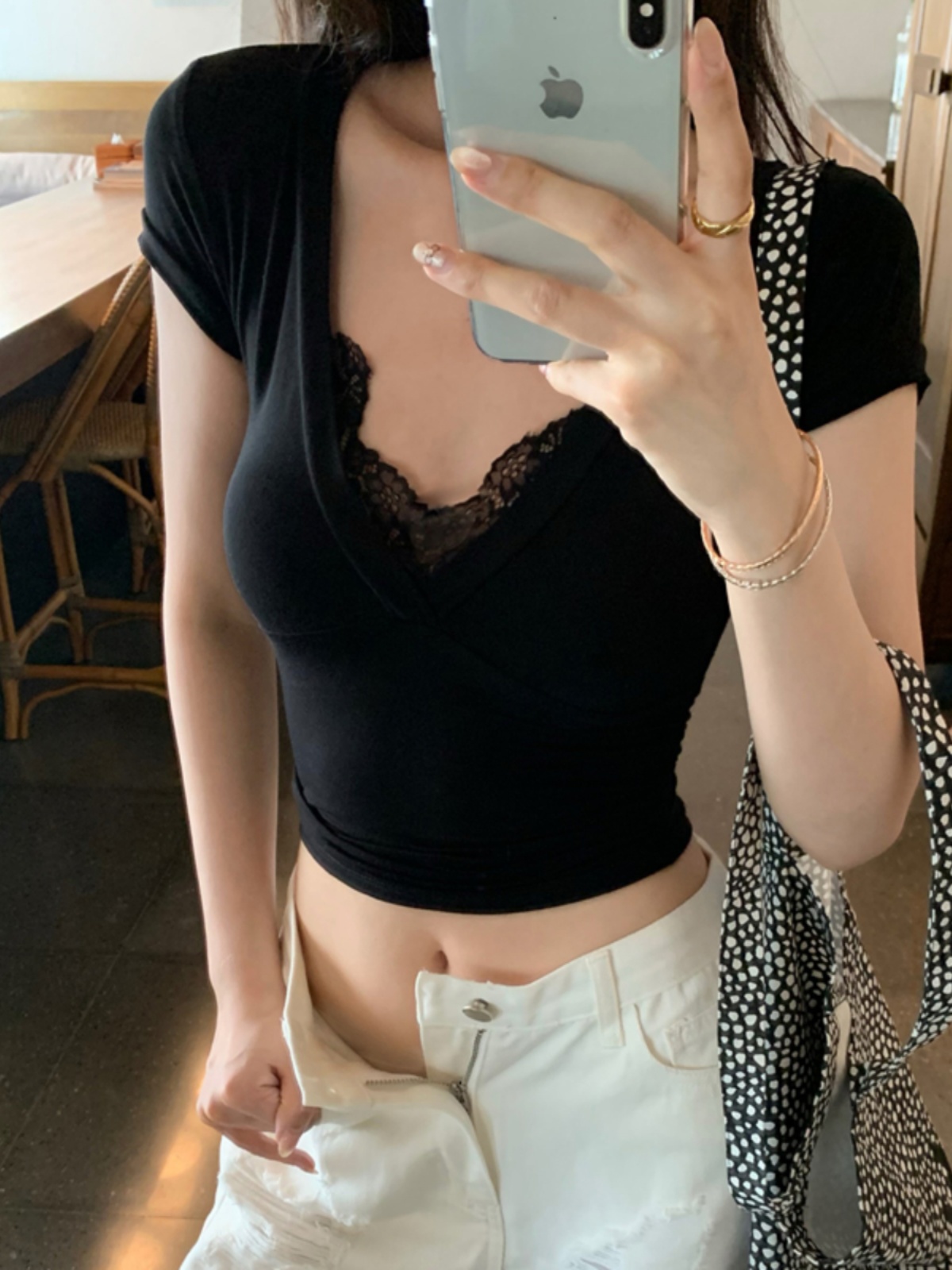该商品信息如下: * 款式设计感强,小众正肩蕾丝拼接,V领短袖T恤,女性感修身短款,气质上衣
