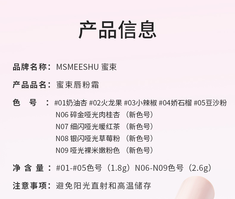 - ¥19.9009#(哑光裸米)嫩粉色,06#(碎金哑光)肉桂杏