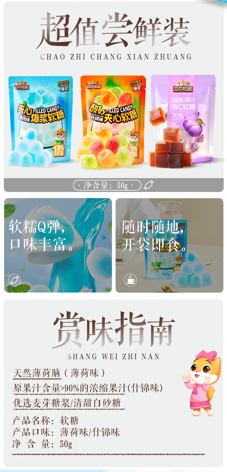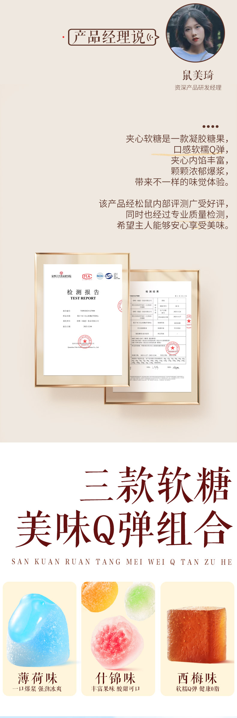 3. 这次购买的商品质量非常好,包装也很精美,口感也非常好,特别是这款爆浆西梅软糖,口感软糯,味道香甜,非常好吃,而且价格也非常实惠,下次还会继续购买!
