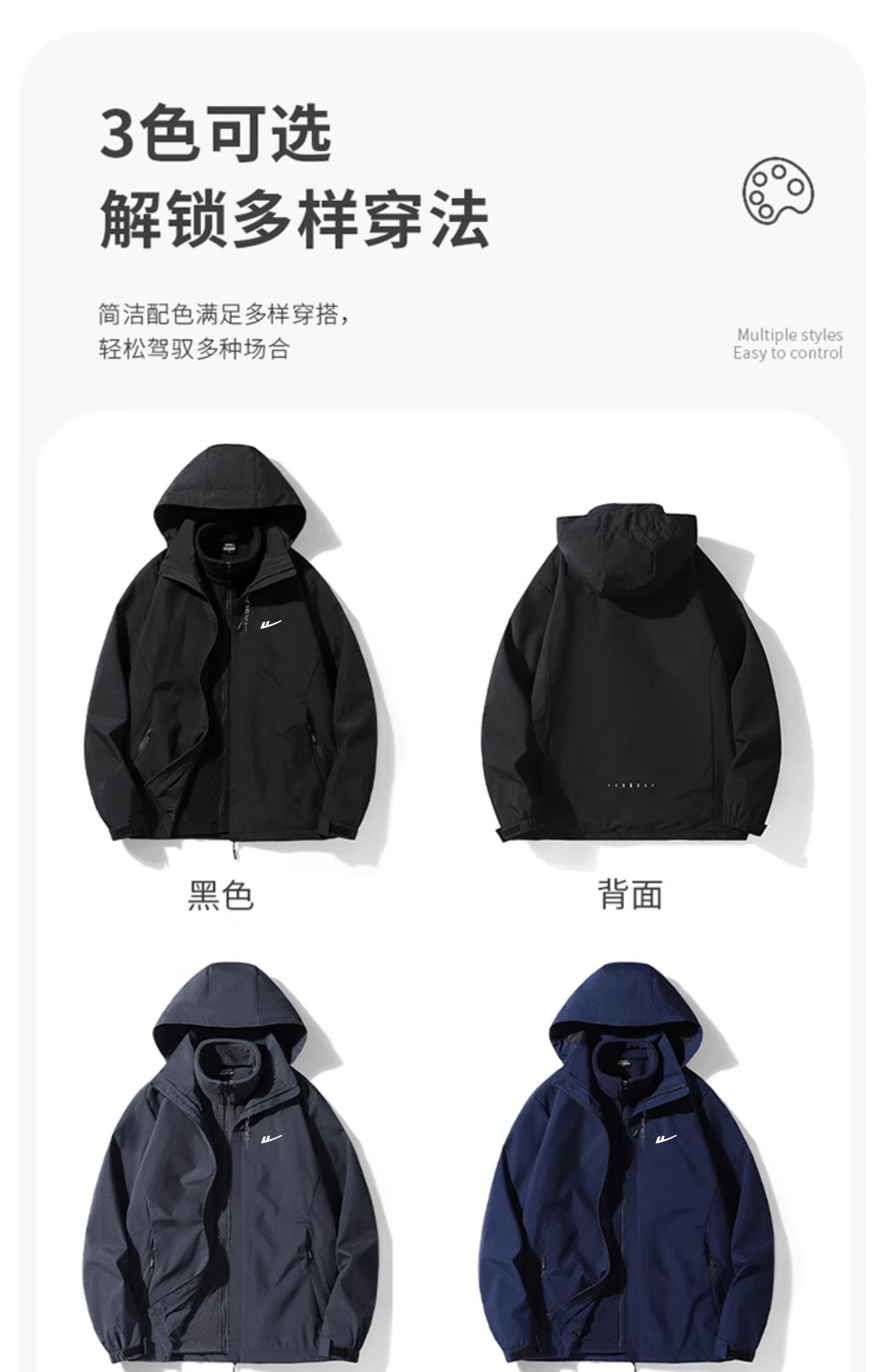 1. **【黑色单夹克 M码】** "版型超正!工装风设计很百搭,配牛仔裤或运动裤都好看。面料防风效果不错,秋冬穿刚好。M码给80-95斤的朋友完全合身,袖长和腰身都很贴合,推荐!" 2. **【米白色单夹克 XL码】** "米白色太温柔了!比黑色更显年轻,但稍微容易脏,需要小心打理。XL码对120斤的我来说宽松舒适,里面穿毛衣也不臃肿,性价比超高!" 3. **【灰色单夹克 3XL码】** "给老爸买的5XL,他180斤穿刚好。灰色低调耐脏,适合日常通勤。面料厚实但不算硬,活动起来没束缚感,89元的价格太划算了!" ### **三合一可拆卸款(黑色/米白/灰色)**