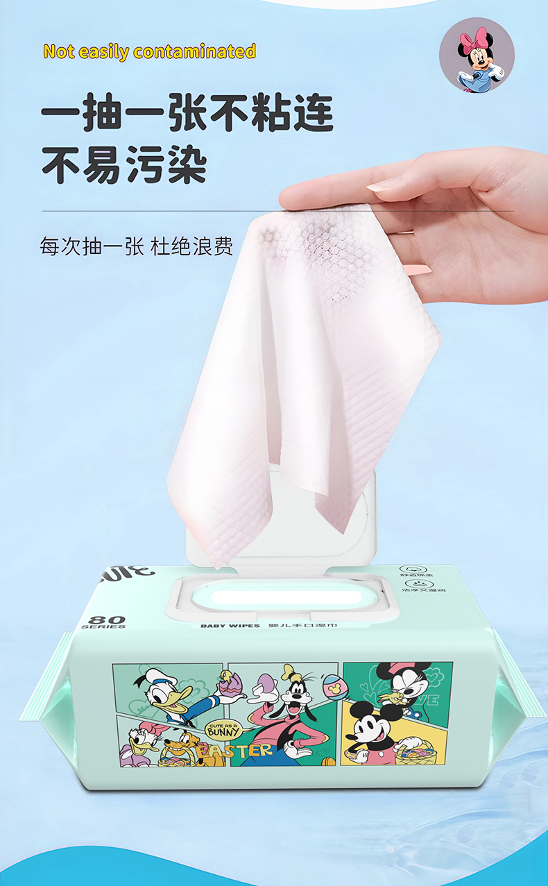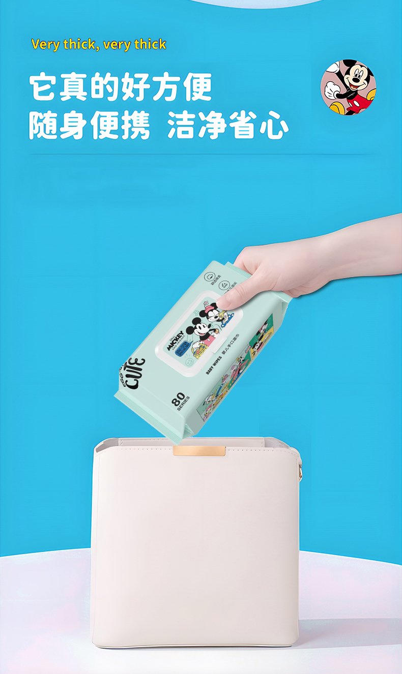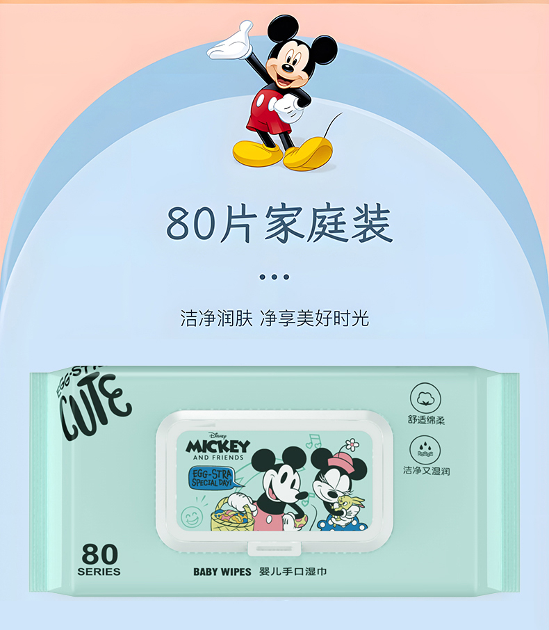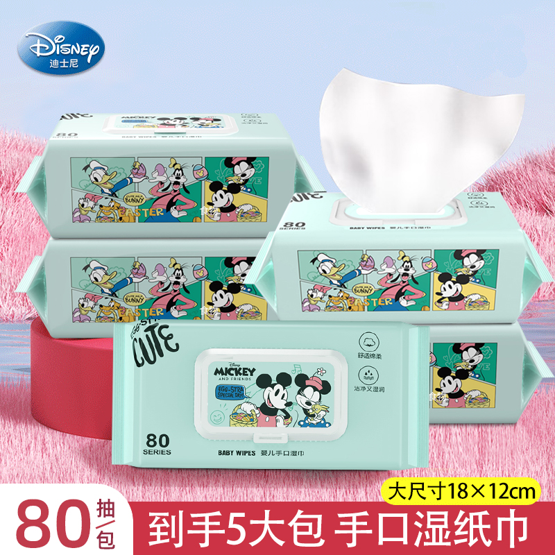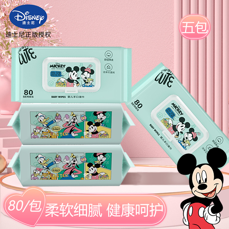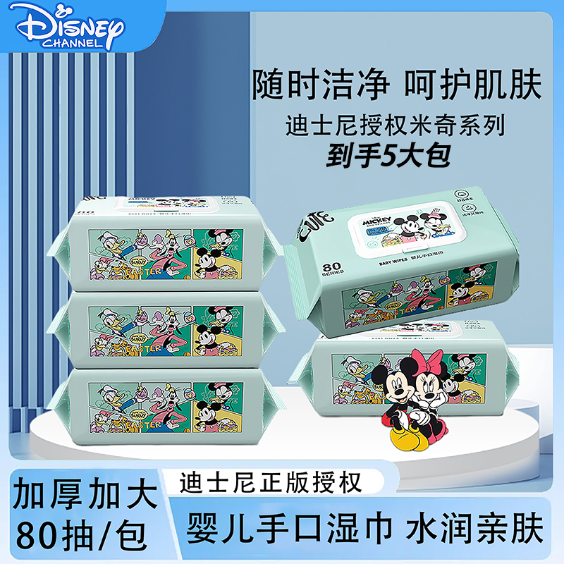 Disney/迪士尼80抽5包米奇爆款婴儿纯水湿巾家庭亲肤水润加厚耐用