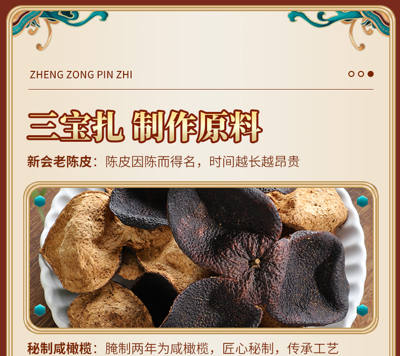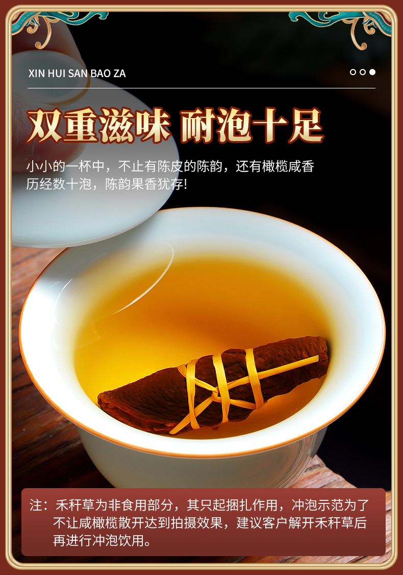 每一颗三宝扎都制作得相当用心,陈皮厚实,色泽自然,搭配着腌制得恰到好处的咸橄榄,口感层次丰富,既有陈皮的甘甜回甘,又有橄榄的咸香爽口,两者相得益彰,实在是味蕾上的享受。