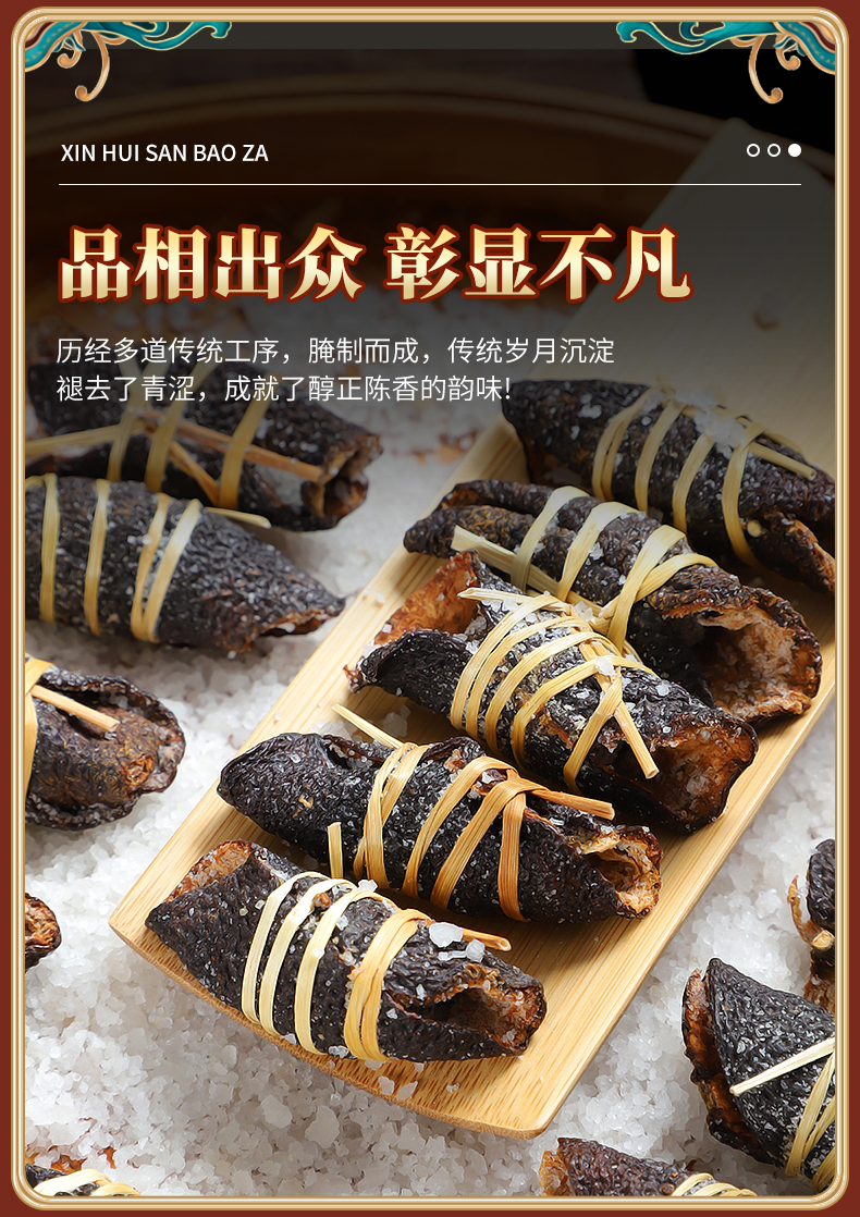作为广东新会的特产,这款三宝扎果然名不虚传,不仅保留了传统风味,还让人感受到了浓浓的地方特色。我特别喜欢在饭后泡上一壶茶,放上几颗三宝扎,不仅解腻助消化,还让人心情愉悦。