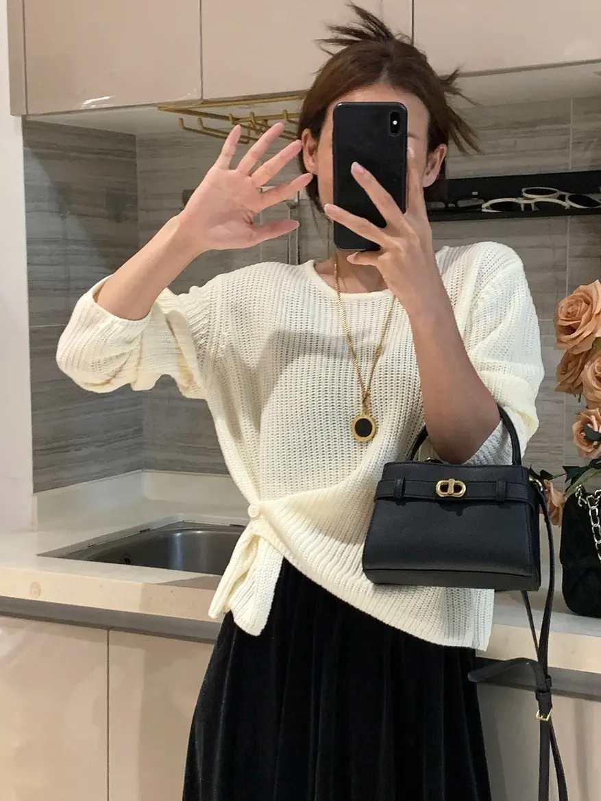 【买家评论】 这款韩系设计感的下摆提扣针织衫真的是秋季衣橱里的宝藏单品!首先,颜色选择非常丰富,我入手的是杏色,穿上后温柔又显气质,非常百搭。无论是搭配牛仔裤还是半身裙,都能轻松驾驭,简约而不失时尚感。 材质方面,毛衣摸起来柔软舒适,穿在身上亲肤不扎人,保暖性也很不错,早晚温差大的时候穿它正合适。提扣的设计非常巧妙,既增加了整体的层次感,又方便调节下摆的宽松度,显得特别有个性。 尺码方面,我按照店铺推荐的体重范围选择了小码(80-120斤),穿起来刚刚好,既合身又不紧绷,活动自如。大码的选择也很贴心,适合不同身材的姐妹们,真是考虑周全。 价格方面,仅需49.9元就能拥有这样一件集美观与实用于一身的毛衣,性价比超高!无论是自留还是送朋友,都是非常不错的选择。 总之,这次购物体验非常满意,商品质量、款式设计、价格都超出了我的预期,已经推荐给身边的朋友了,相信她们也会喜欢的!