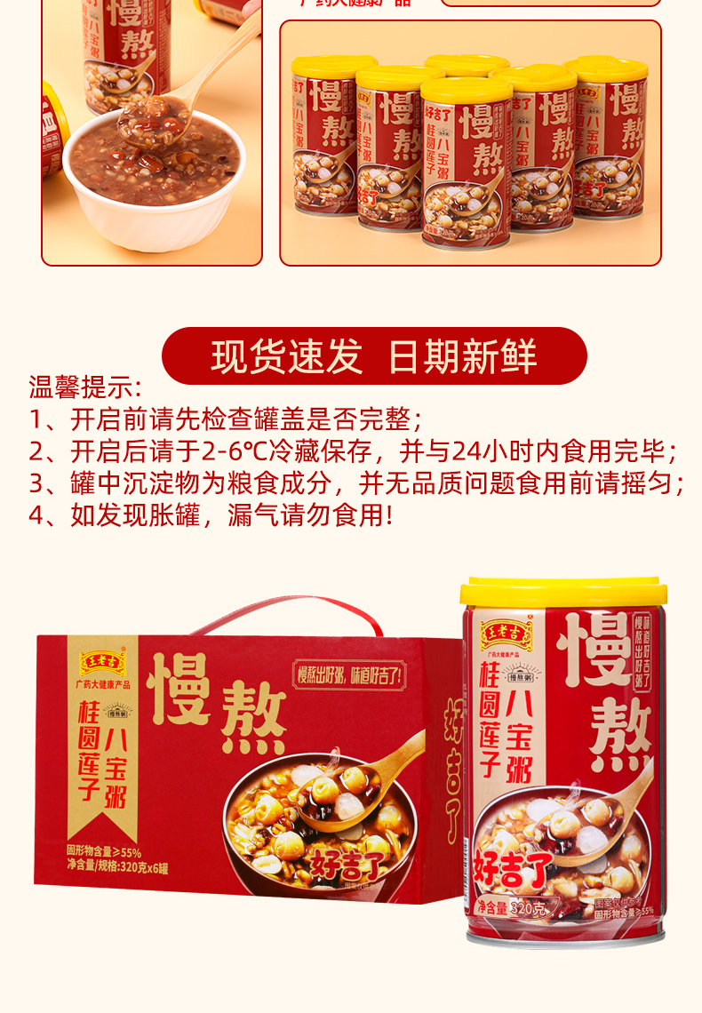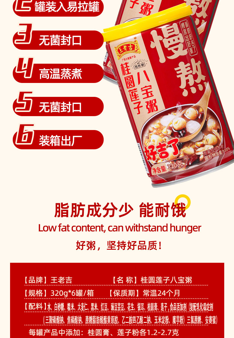 非常满意这次的购物体验!王老吉桂圆莲子八宝粥真的是家庭早餐的优选,不仅包装精美,而且整箱六罐的设计非常贴心,方便存储又适合家庭分享。每罐320g的分量刚刚好,既不会吃撑又能满足早餐的营养需求。