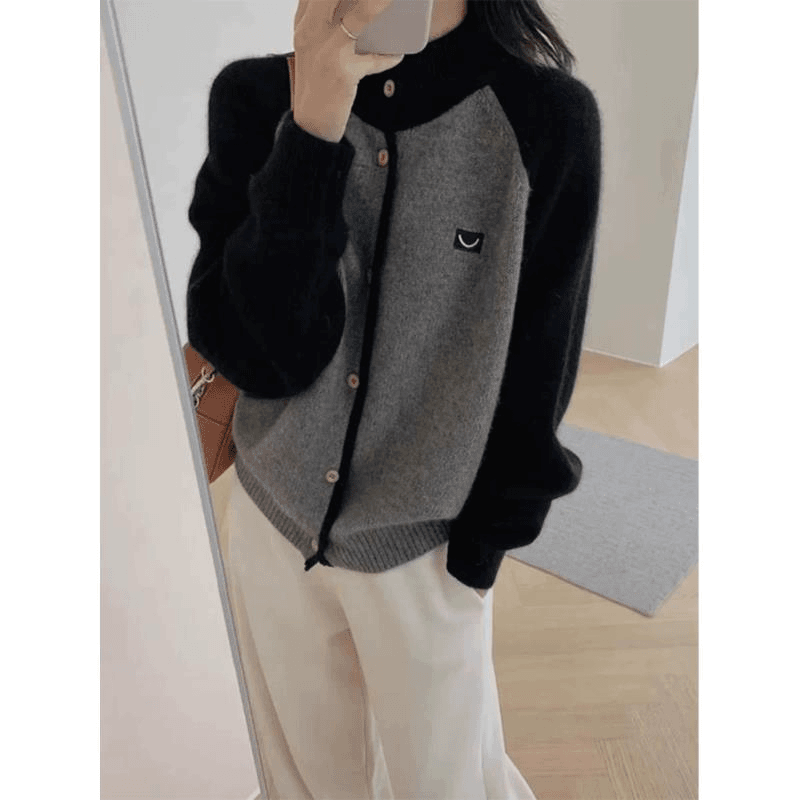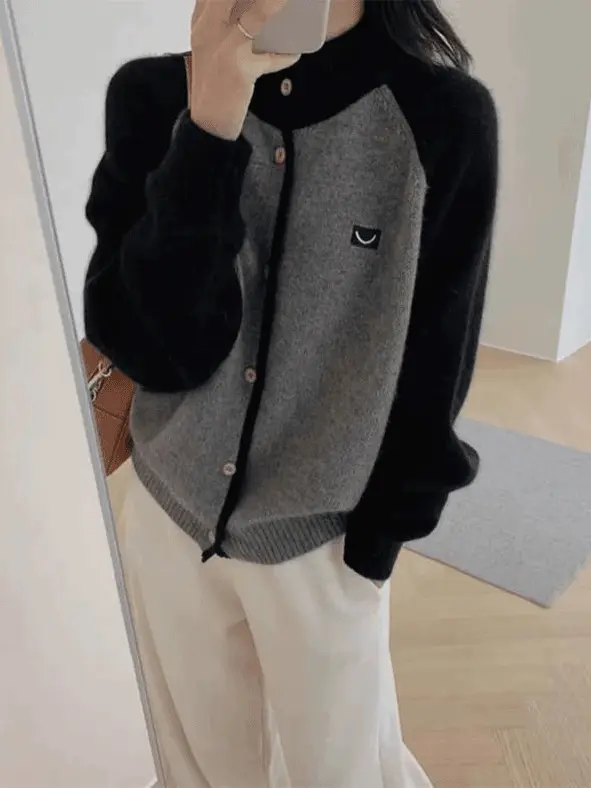 3594撞色圆领针织开衫外套女欧洲站欧货韩系风长袖针织衫毛衣
