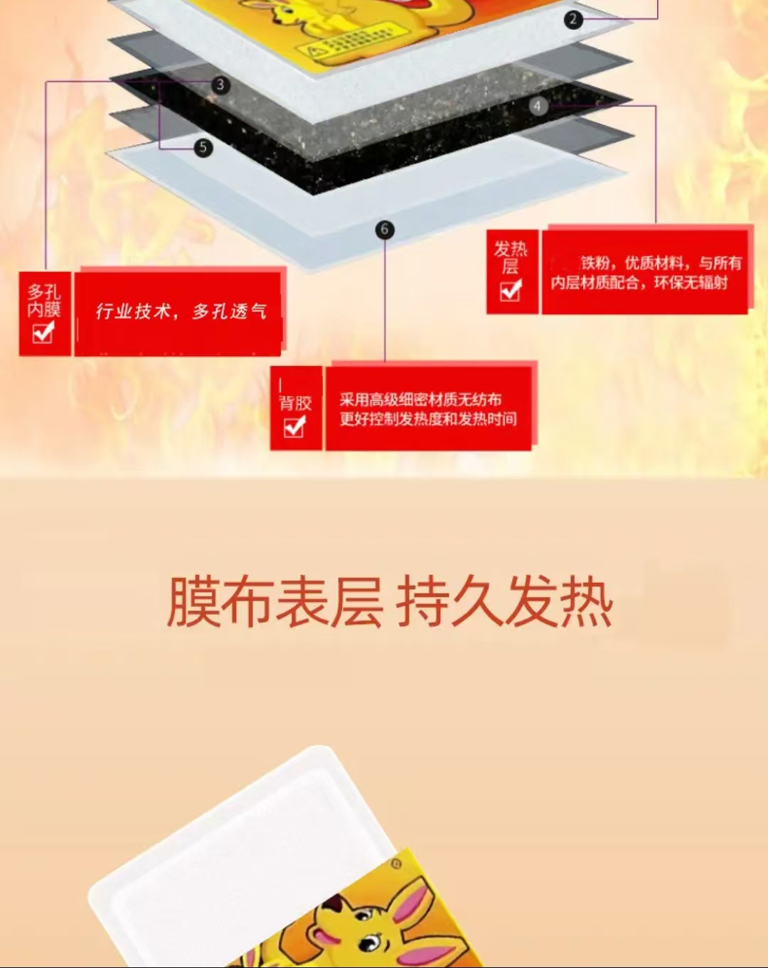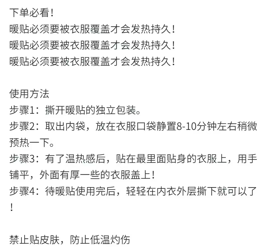 非常满意这次的购物体验!这款暖宝宝贴真的是秋冬季节的暖心小物,价格超实惠,100片只要19.98元,性价比超高!每包10片的设计非常贴心,无论是上班、外出还是家里日常使用,都超级方便。 暖宝宝的发热效果也很棒,贴上不久就能感受到温暖,而且持续时间也挺长的,对于怕冷的我来说简直是救星。特别是冬天手脚容易冰凉的时候,贴上几片暖宝宝,整个人都暖和起来了,再也不用担心寒冷侵袭。 材质也很安全,没有刺鼻的味道,贴在皮肤上很舒服,不会觉得烫,非常适合老人和学生使用。包装也很精美,携带方便,每次需要的时候随手就能找到。