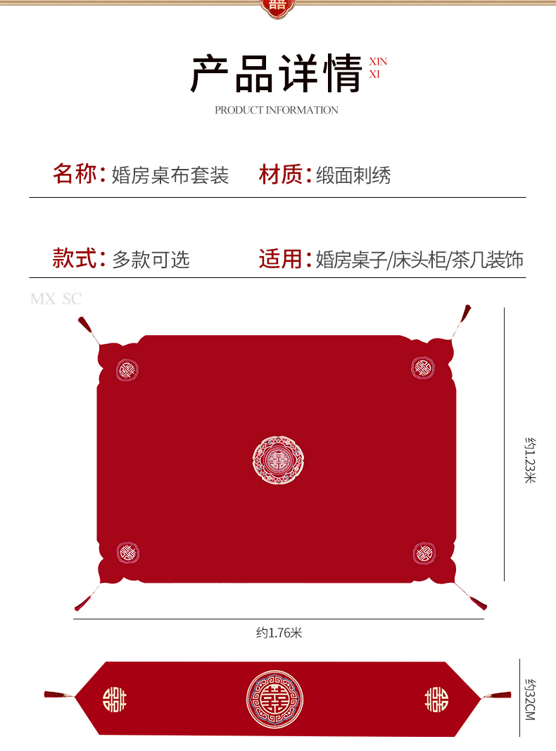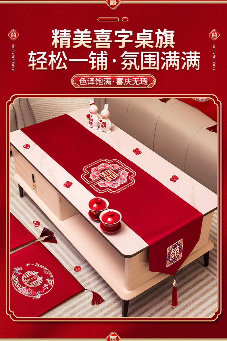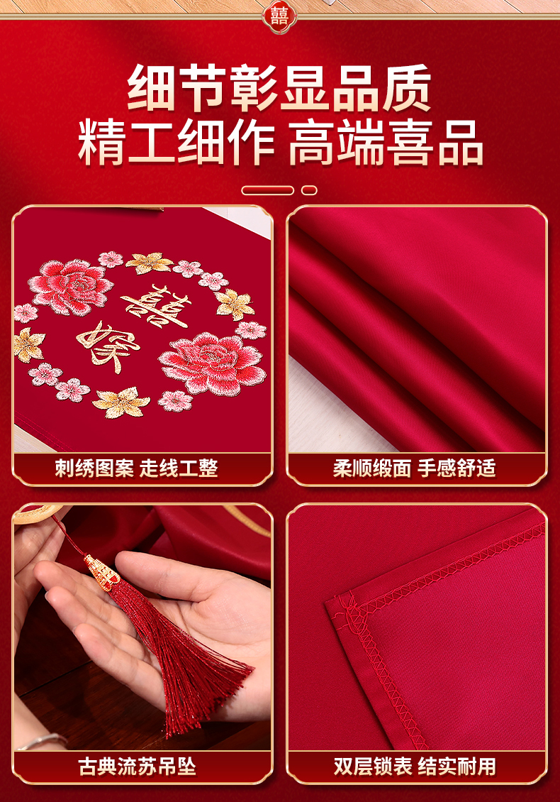 - ¥35.001张桌旗【新婚燕尔流苏吊坠款·约209*32cm】加厚贡缎刺绣