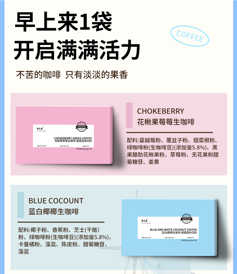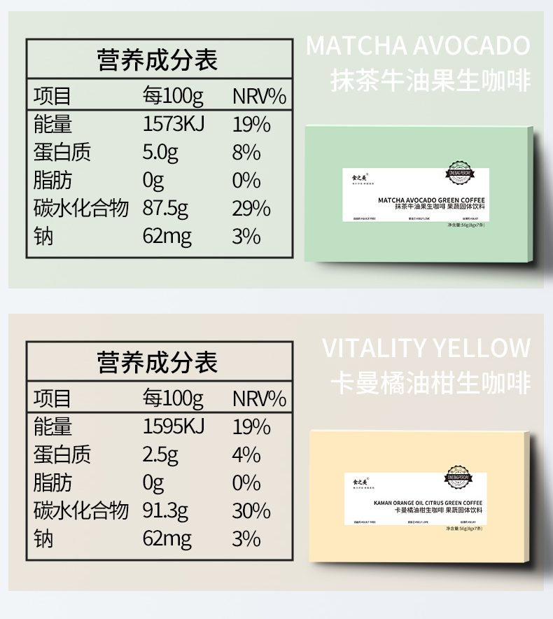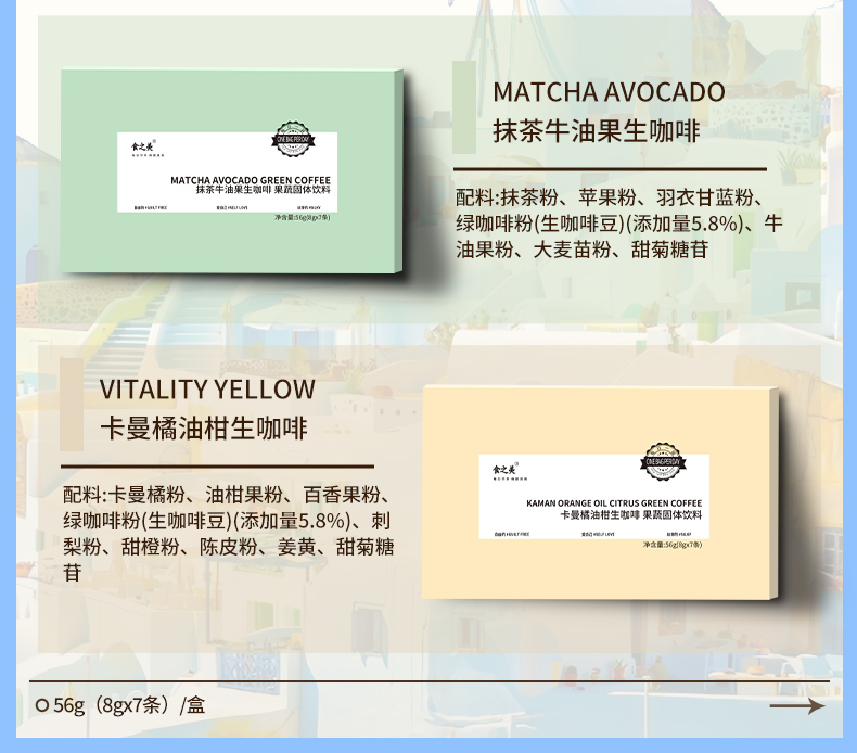 - ¥19.99 56g*1盒,【4盒全家福套餐】蓝白椰椰*1+卡曼橘油柑*1+抹茶牛油果*1+花楸果莓莓*1