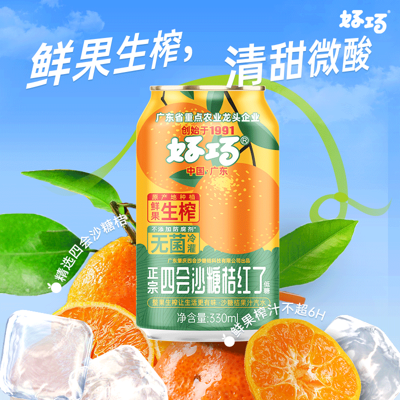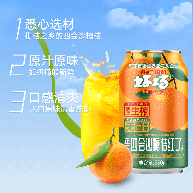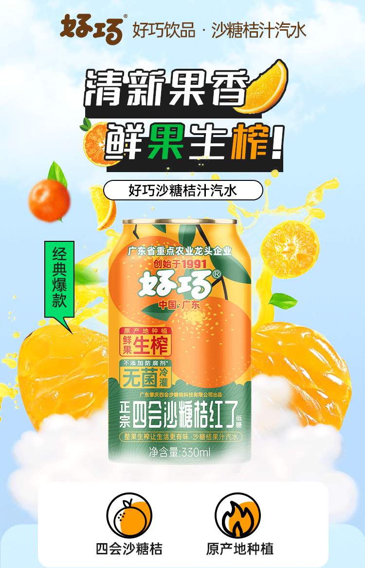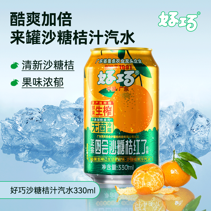 【夏日特惠】好巧生榨沙糖桔汽水330ml*6罐低糖桔汁经典碳酸饮料