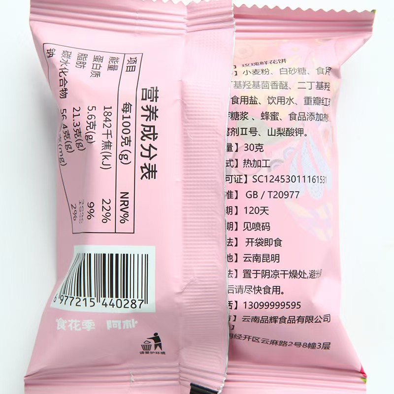 每枚鲜花饼都是30g的精致小包装,恰到好处的分量既不会吃太多影响工作,又能完美满足我的解馋需求。饼皮薄而酥软,轻轻一咬就碎在嘴里,内馅则是满满的玫瑰花馅,甜而不腻,满口留香,仿佛能品尝到云南玫瑰园中的芬芳与甜蜜。