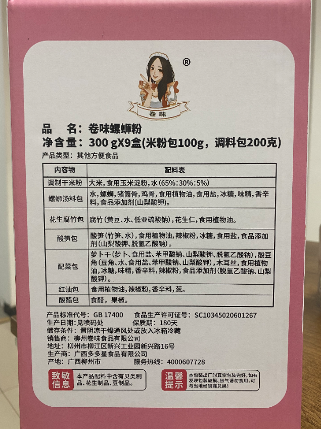 非常满意这次在贵店购买的螺蛳粉体验!首先,包装非常精美,盒装设计既方便携带又显得高端大气,作为礼物送给朋友也是个不错的选择。打开盒子,一股浓郁的螺蛳汤香扑鼻而来,瞬间勾起了我对柳州地道风味的无限向往。
