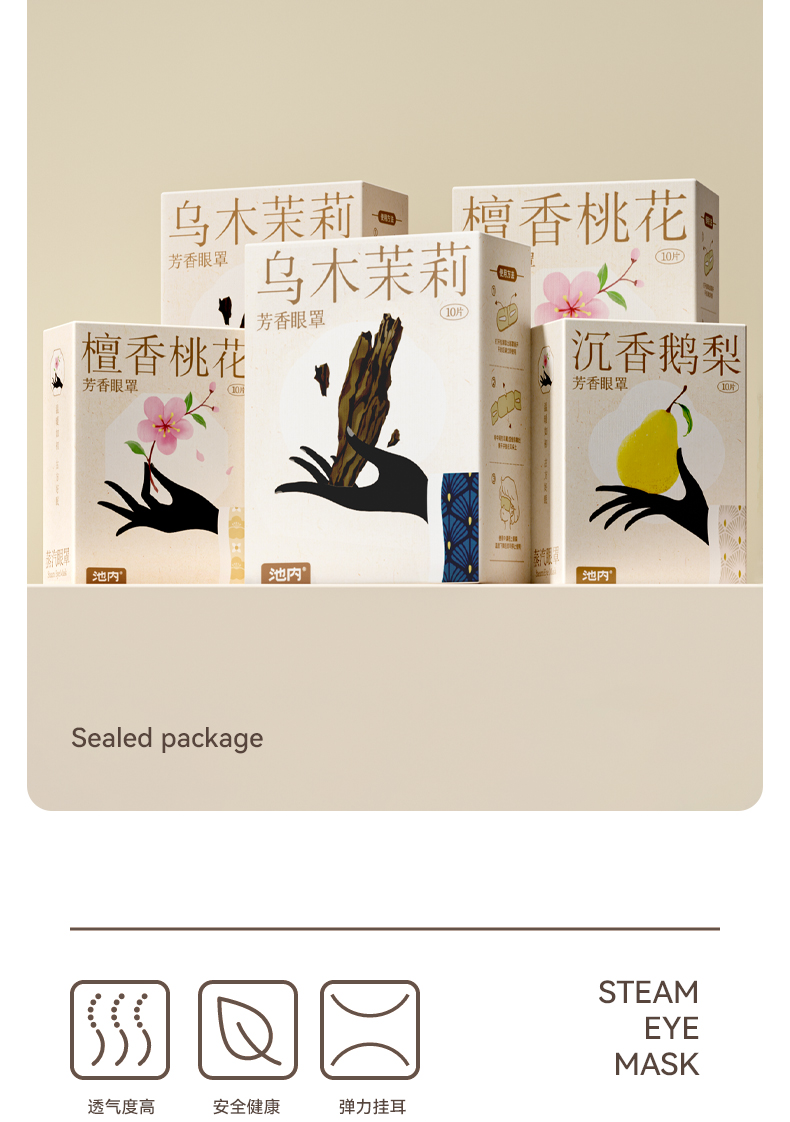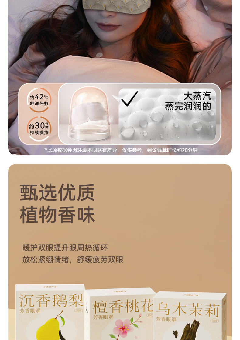 非常满意这次购买的蒸汽眼罩!首先,包装精美,打开就能闻到淡淡的草本香氛,非常治愈人心。我分别尝试了沉香鹅梨、檀香桃花和乌木茉莉三种口味,每种都有它独特的香气,让人在使用时感觉特别放松。沉香鹅梨的味道清新自然,仿佛置身于春日的花海之中,热敷的效果很好
