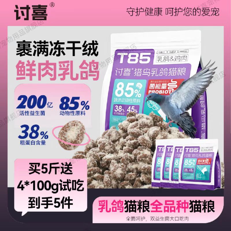 - ¥59.66正装5斤*1袋(送四袋100g试吃装),讨喜--乳鸽鲜肉猫粮--菌能量促吸收--呵护肠胃