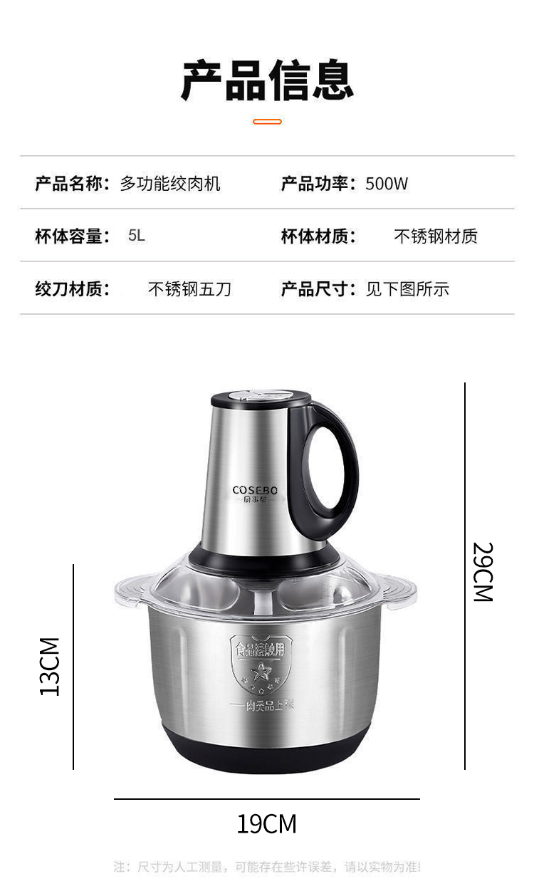 X【德国/厨事帮】5升搅馅和面绞肉机家用不锈钢电动料理器打肉蒜蓉