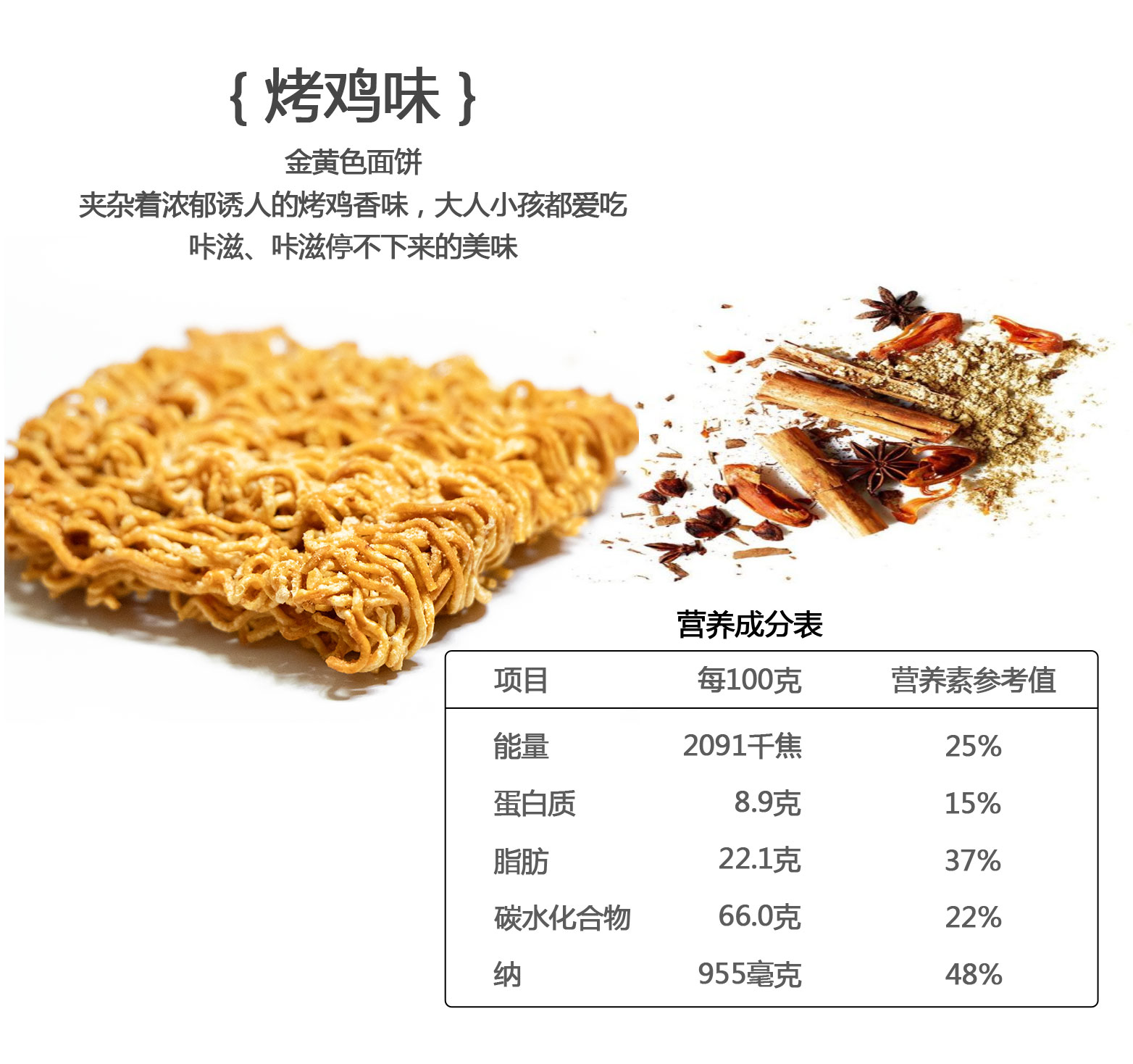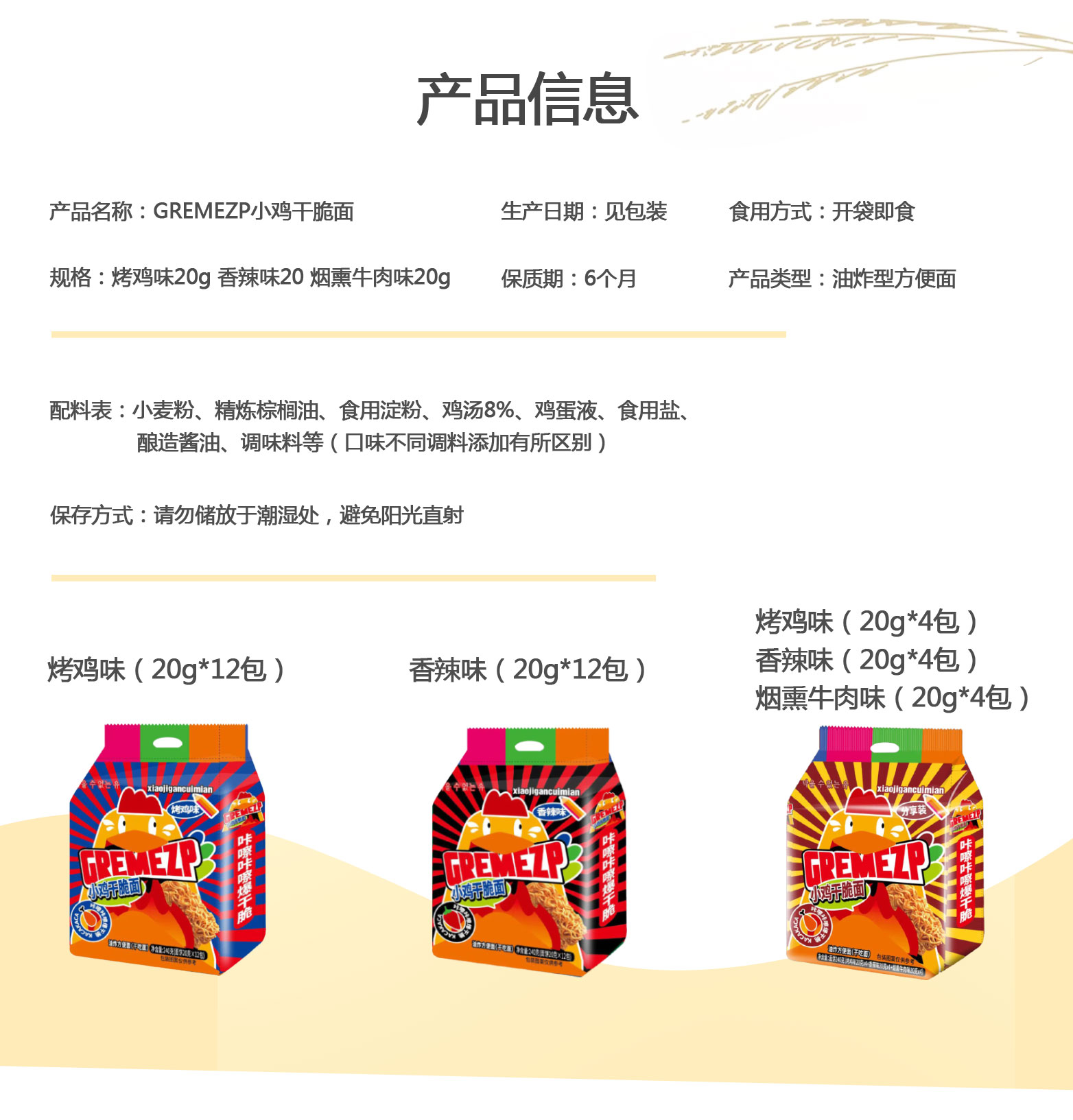 - ¥12.90烤鸡味干脆面20g*4包+香辣味干脆面20g*4包+烟熏牛肉味20g*4包