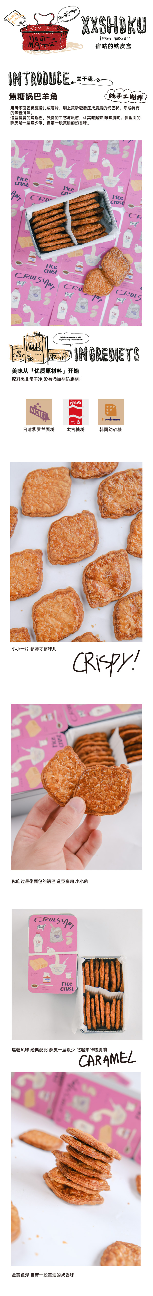 打开铁盒的那一刻,就被它精致的包装和诱人的香气所吸引。每一片羊角锅巴都包裹着浓郁的焦糖,看起来就让人食欲大增。 尝了一口,真是惊艳!锅巴酥脆可口,焦糖的味道在口中慢慢化开,甜而不腻,香浓四溢。每一口都能感受到焦糖与锅巴的完美结合,带来了前所未有的味蕾体验。 而且,这款羊角锅巴的分量也很足,100克的包装刚好可以满足我一次的小零食需求。无论是自己享用还是与朋友分享,都是极佳的选择。 总的来说,这款【宿咕的铁皮盒焦糖锅巴羊角】无论是从口感、香气还是包装上,都给了我很大的惊喜。虽然价格略高,但绝对物有所值,值得一试!强烈推荐给喜欢尝试新奇美食的朋友们!