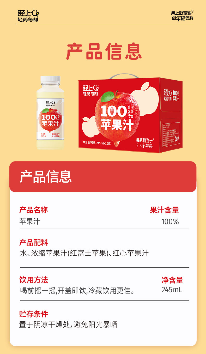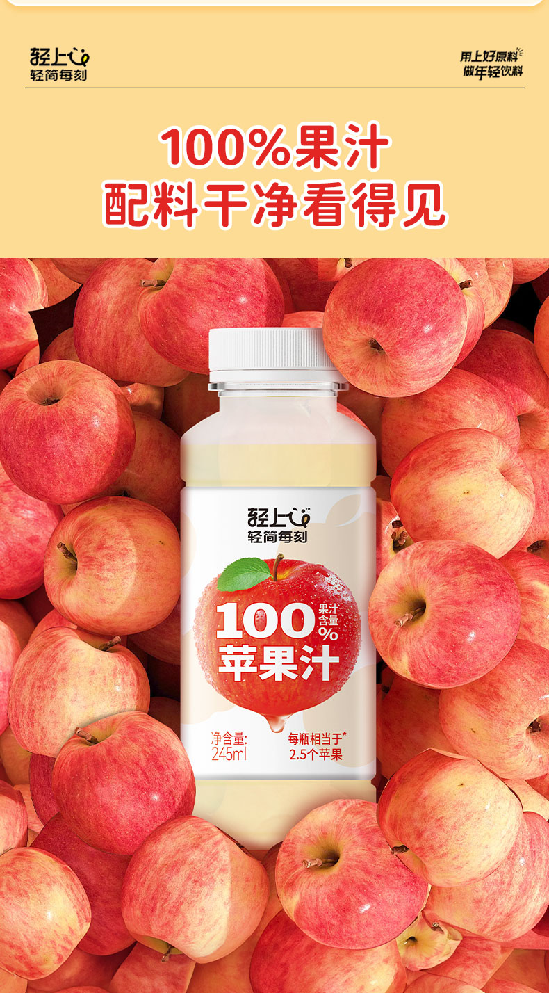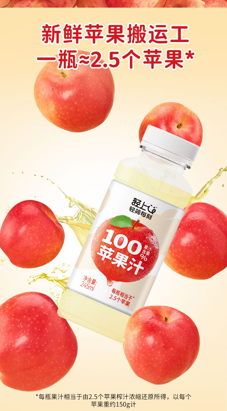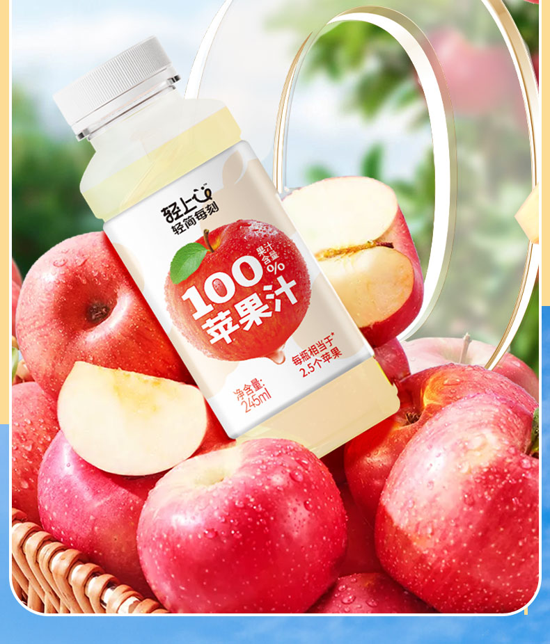 收到这箱苹果汁真是惊喜连连!首先,包装严密,每瓶都完好无损,245ml的容量比描述的220ml还多出了些,感觉赚到了呢! 说是“一瓶喝掉2.5个苹果”,初时半信半疑,但尝过之后,那浓郁的苹果香味和自然的清甜,确实让人仿佛直接啃了好几个新鲜苹果般满足,100%果汁的承诺绝非虚言! 整箱10瓶的设计太贴心了,无论是家庭聚会还是日常解渴,都是极佳的选择。每次打开一瓶,都是对味蕾的小小奖赏,清爽不腻,特别适合炎炎夏日冰镇后饮用,解暑神器无疑! 最最关键的是,29.9元的价格能买到这样高品质的果汁,性价比超高,比外面卖的某些勾兑饮料健康多了,真是物超所值! 总之,这次购物非常满意,已经推荐给朋友们了,以后还会回购的!
