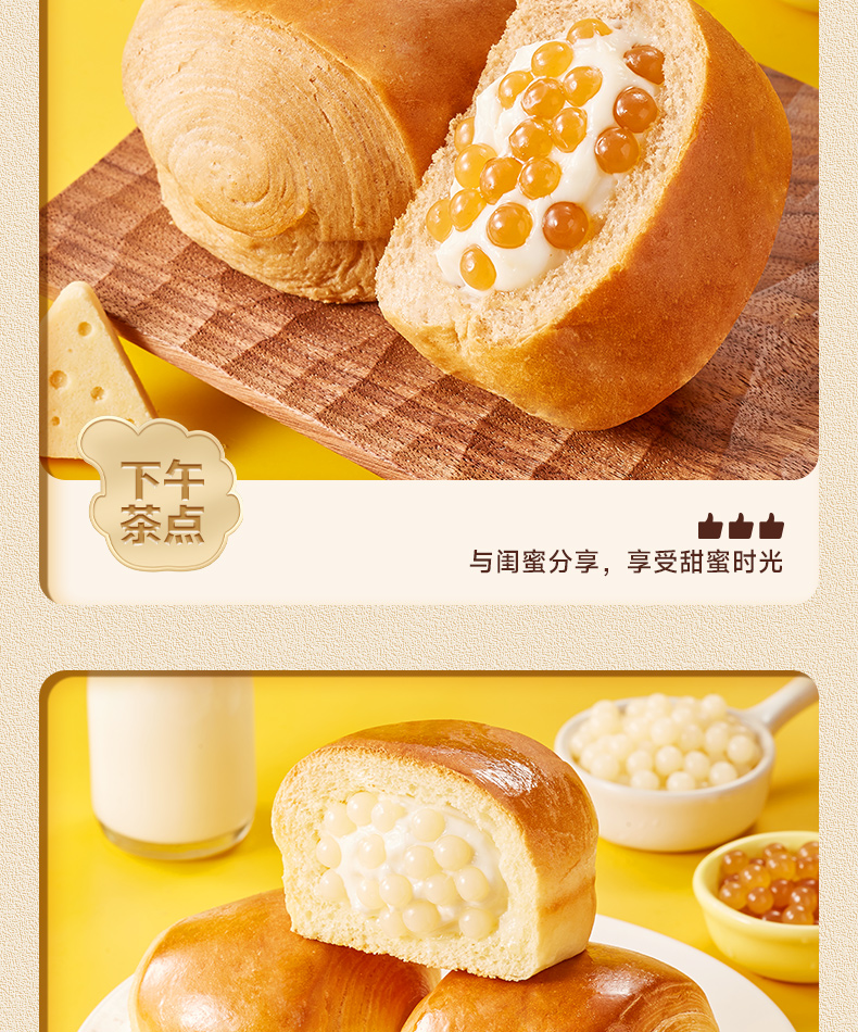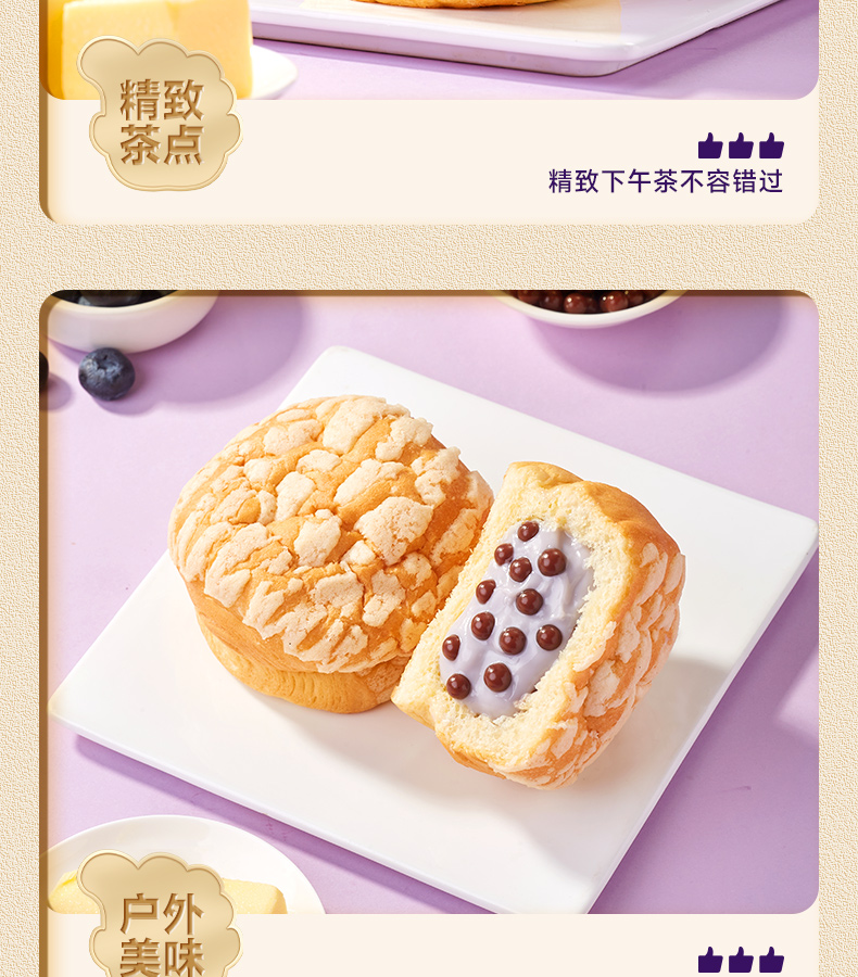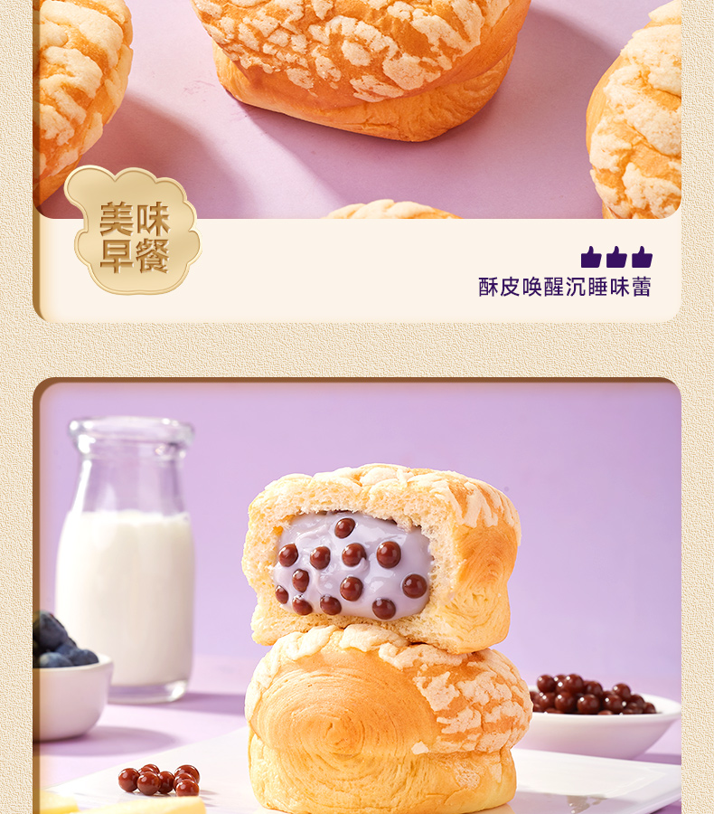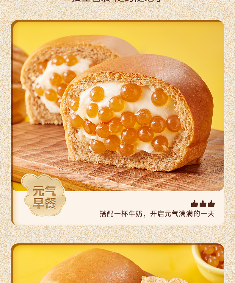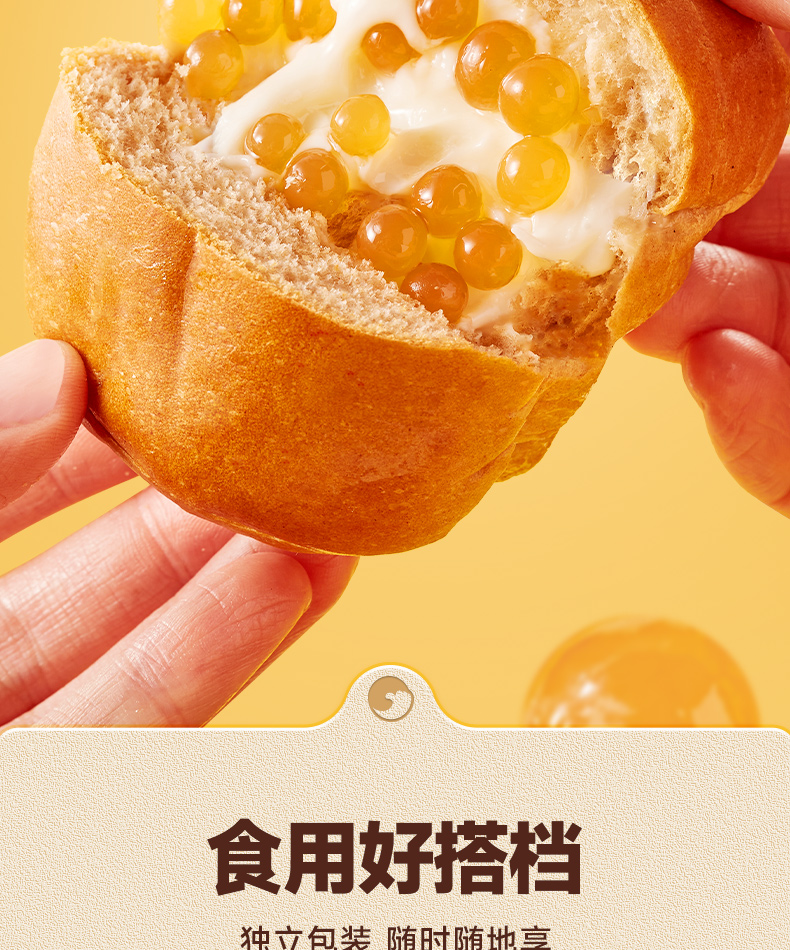 最让我惊喜的是面包里的啵啵爆珠,每一口都能感受到爆珠在口中轻轻炸开的奇妙体验,搭配上香软的面包体和甜蜜的流心,口感层次丰富,既满足了味蕾的享受,又不失为一种健康的小食。作为早餐,它方便快捷,营养均衡;而作为休闲零食,更是解馋的好伙伴。