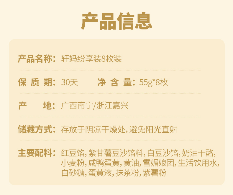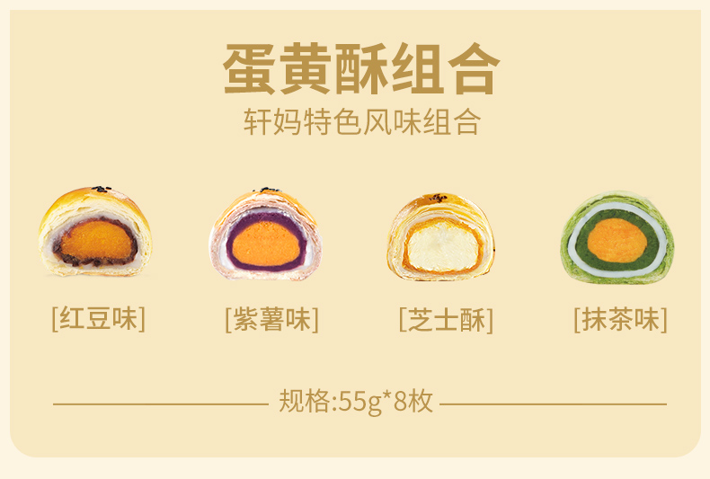 - ¥55.80纷享装8枚(原味红豆酥2枚+芝士酥2枚+紫薯酥2枚+抹茶酥2枚),440g*1盒