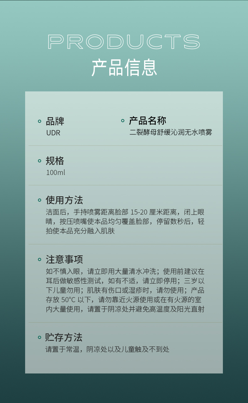 - ¥6.99 UDR二裂酵母舒缓沁润无水喷雾100ml*1瓶