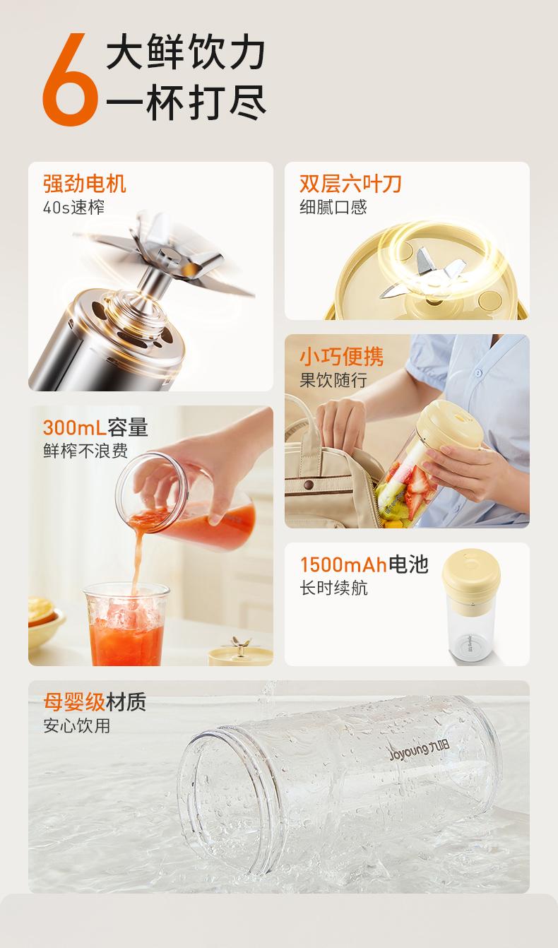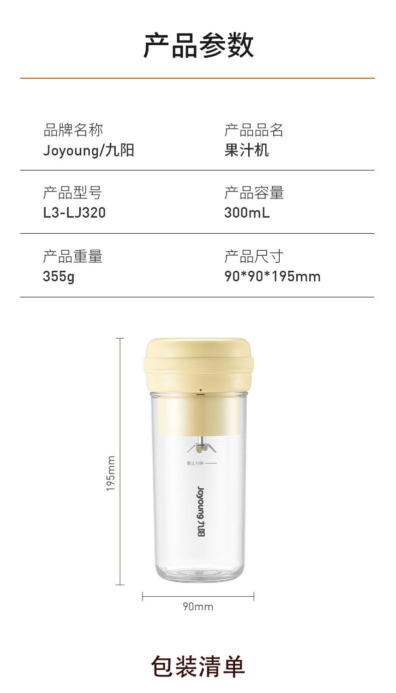 九阳便携家用榨汁机多功能榨汁杯无线果汁杯果蔬汁奶昔 L3-LJ320
