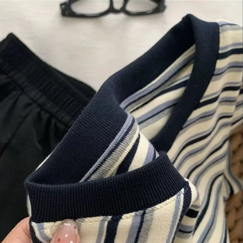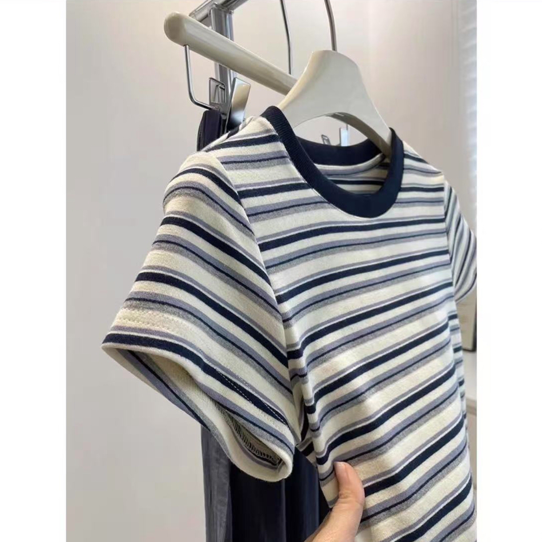 【续曲】精纱棉撞色条纹显瘦短袖T正肩2025年夏新款
